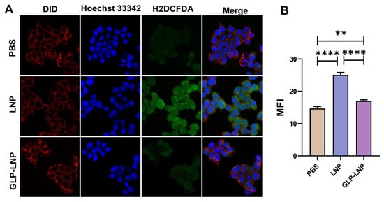 To verify the mechanism of GLP in alleviating LNP-induced oxidative stress—a key pathway for enhancing cell viability and transfection efficiency—we employed the H2DCFDA probe for quantitative reactive oxygen species (ROS) assessment. As can be seen from the confocal images in Figure 4A, the PBS control group exhibited weak green fluorescence signals, staying in a state of equilibrium, whereas the LNP group displayed strong green fluorescence signals, indicating the occurrence of certain oxidative damage within the cells; conversely, the green fluorescence intensity of the GLP-LNP co-treatment group decreased to a level close to that of the PBS group, visually confirming the scavenging of partial ROS and the recovery of metabolism. Analysis in Figure 4B revealed significant differences in mean fluorescence intensity (MFI): PBS-treated cells maintained redox equilibrium, whereas cells exposed to LNPs exhibited severe oxidative damage with a significant increase in MFI (**** p < 0.0001); crucially, GLP-LNP co-treatment significantly reduced ROS levels, showing a significantly lower MFI compared to the LNP group (**** p < 0.0001). These quantitative MFI data are completely consistent with the confocal image observations.