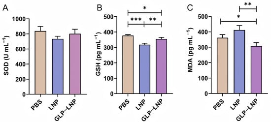 Intracellular oxidative stress evaluation. (A–C) The results of SOD, GSH, and MDA levels in HEK293T cells treated with three different formulations (PBS, LNP, and GLP-LNP) for 8 h. * p < 0.05, ** p < 0.01, *** p < 0.001, (n = 3).