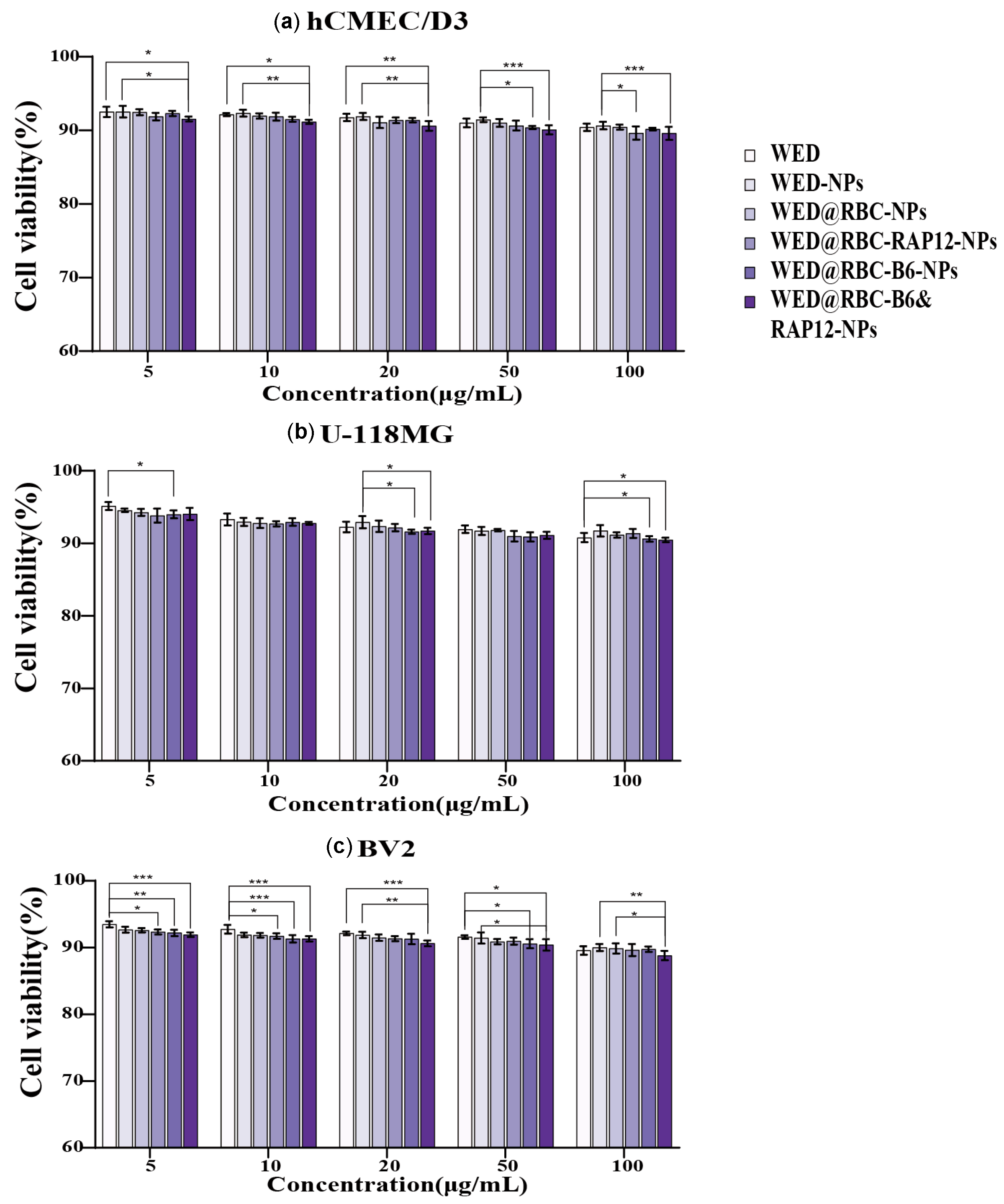 | WED@RBC-B6&RAP12-NPs | 215.23 ± 6.87 | −9.87 ± 0.87 | 84.11 ± 0.26 | 23.12 ± 0.35 |