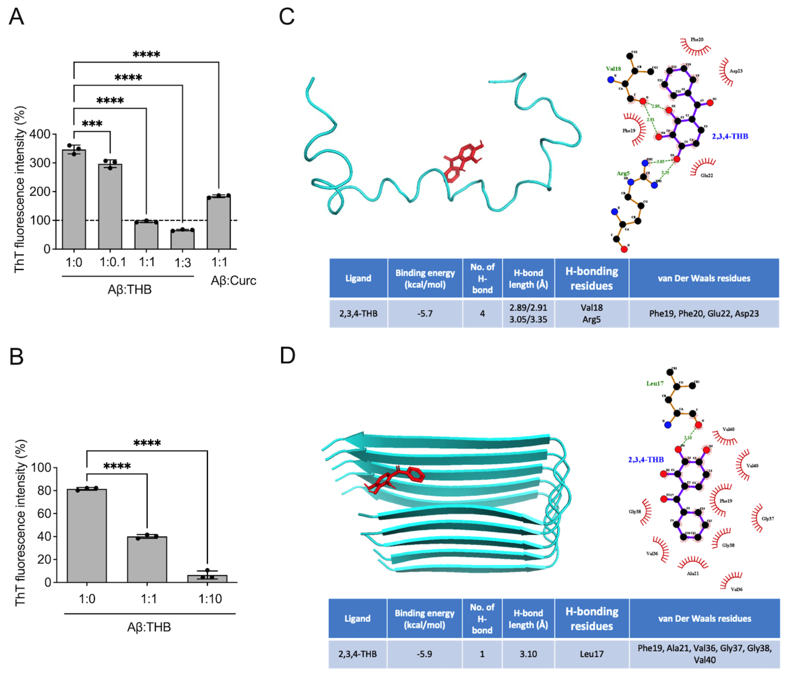 21]. In the present study, molecular docking analysis predicted that THB forms hydrogen bonds with Val18 and Arg5 and engages in hydrophobic interactions with residues including Phe19, Phe20, Glu22, and Asp22. These findings suggest that THB may interact with residues within or near the Aβ