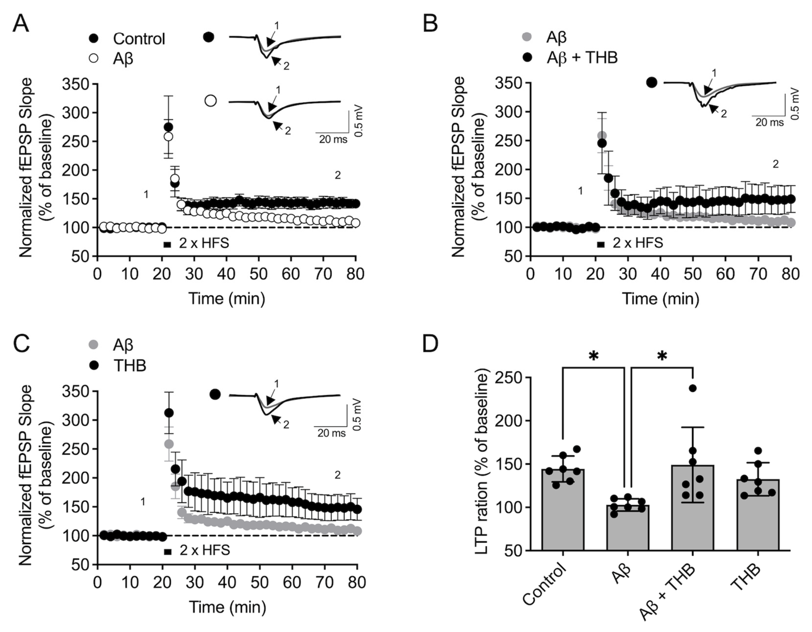 Electrophysiological measurements were conducted in artificial cerebrospinal fluid (aCSF) containing NaCl (124 mM), KCl (3 mM), NaHCO3 (26 mM), NaH2PO4 (1.25 mM), CaCl2 (2 mM), MgSO4 (1 mM), and D-glucose (10 mM). Following rapid isolation, the hippocampus was submerged in chilled aCSF. Coronal slices (400 μm thick) were prepared using a McIlwain tissue chopper and incubated in oxygenated aCSF (95% O2/5% CO2, 24–27 °C) for at least 1 h before being moved to the recording chamber. Field excitatory postsynaptic potentials (fEPSPs) were recorded from the stratum radiatum of area CA1, with a stimulating electrode placed on the Schaffer collateral–commissural pathway. To induce long-term potentiation (LTP), high-frequency stimulation (HFS, two trains of 100 pulses at 100 Hz) was applied after 20 min of baseline stability, and LTP was observed for 60 min post HFS. In the in vitro experiments, Aβ1–42 aggregates and THB were applied to the tissue slices for 2 h immediately before electrophysiological recording.