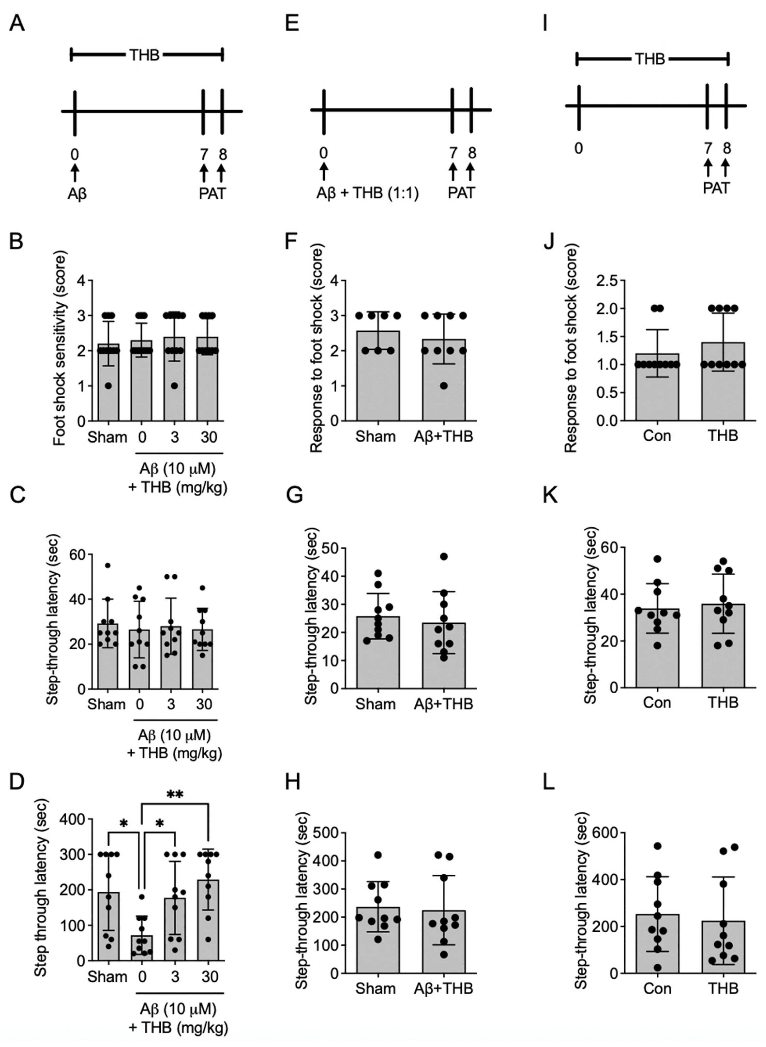 1–42 was pre-incubated alone for 24 h at 37 °C with gentle agitation. These aggregates were then administered via intracerebroventricular injection into mice (coordinates: AP, −2.00 mm; mL, 0 mm; DV, −2.00 mm). THB (3 or 30 mg/kg, p.o.) was suspended in a 10% Tween 80 vehicle and administered daily for indicated days, starting 1 h after the aggregated Aβ