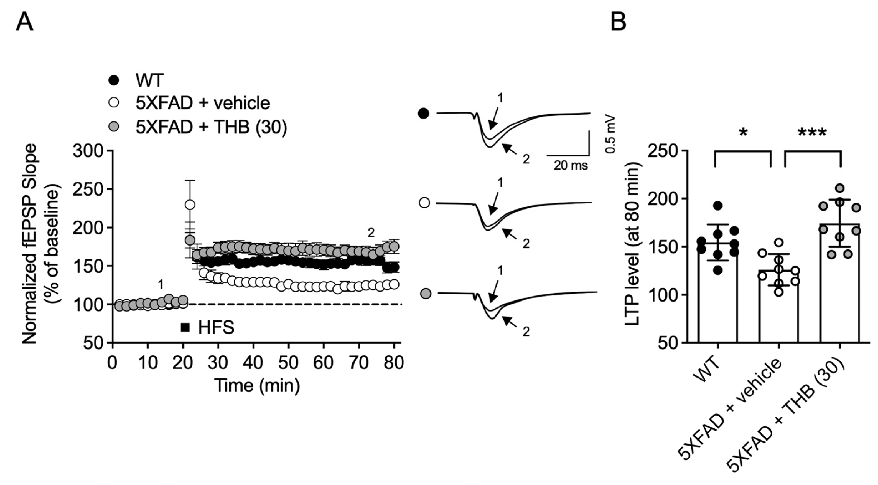 1–42 (24 h incubation) injection. The passive avoidance test was initiated on the 6th day post-injection. For the 5XFAD model, THB was administered for 30 days beginning at 7 months of age. After the treatment period, brains were harvested and divided; one hemisphere was processed for electrophysiological analysis, and the other was used for immunohistochemistry.