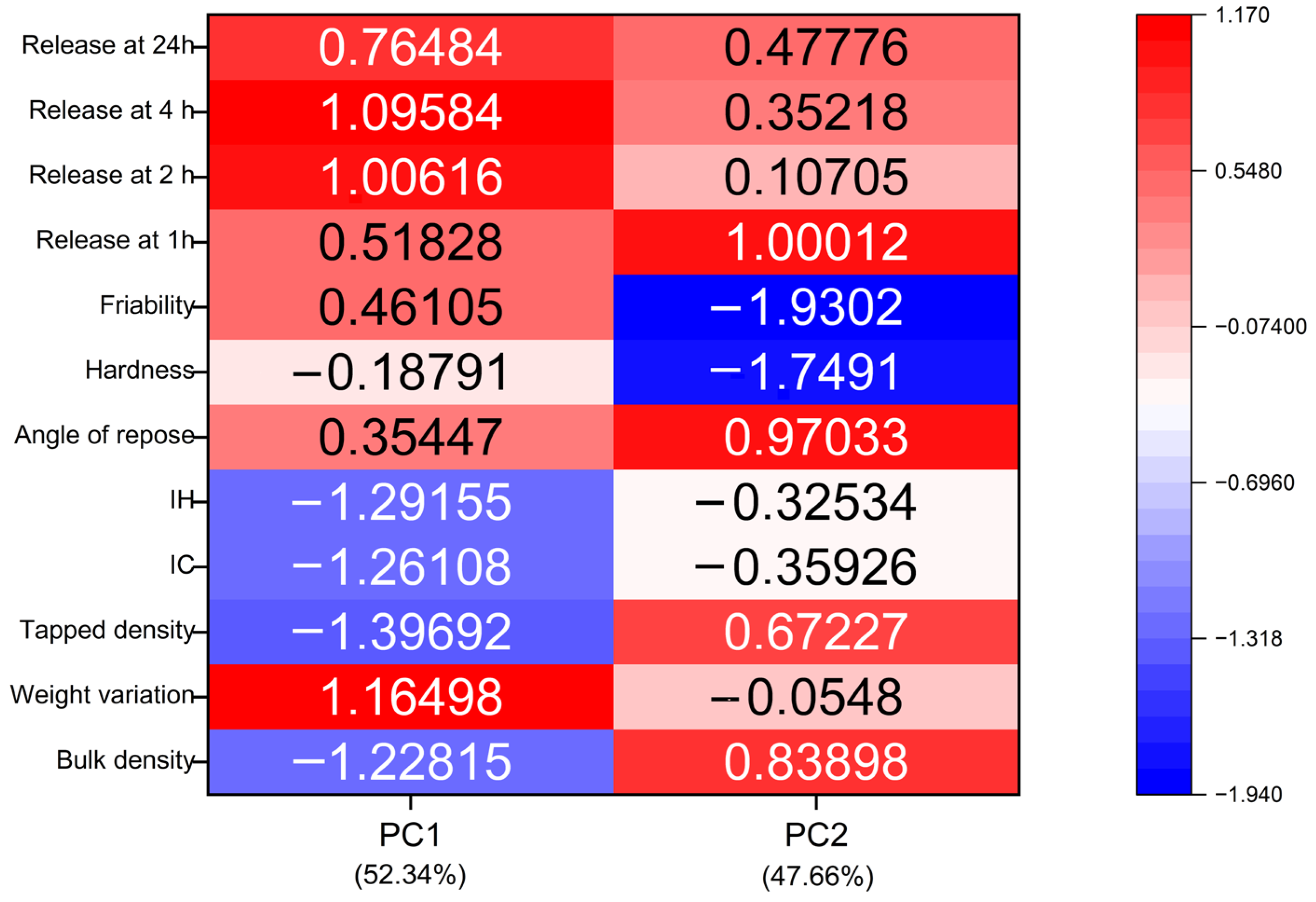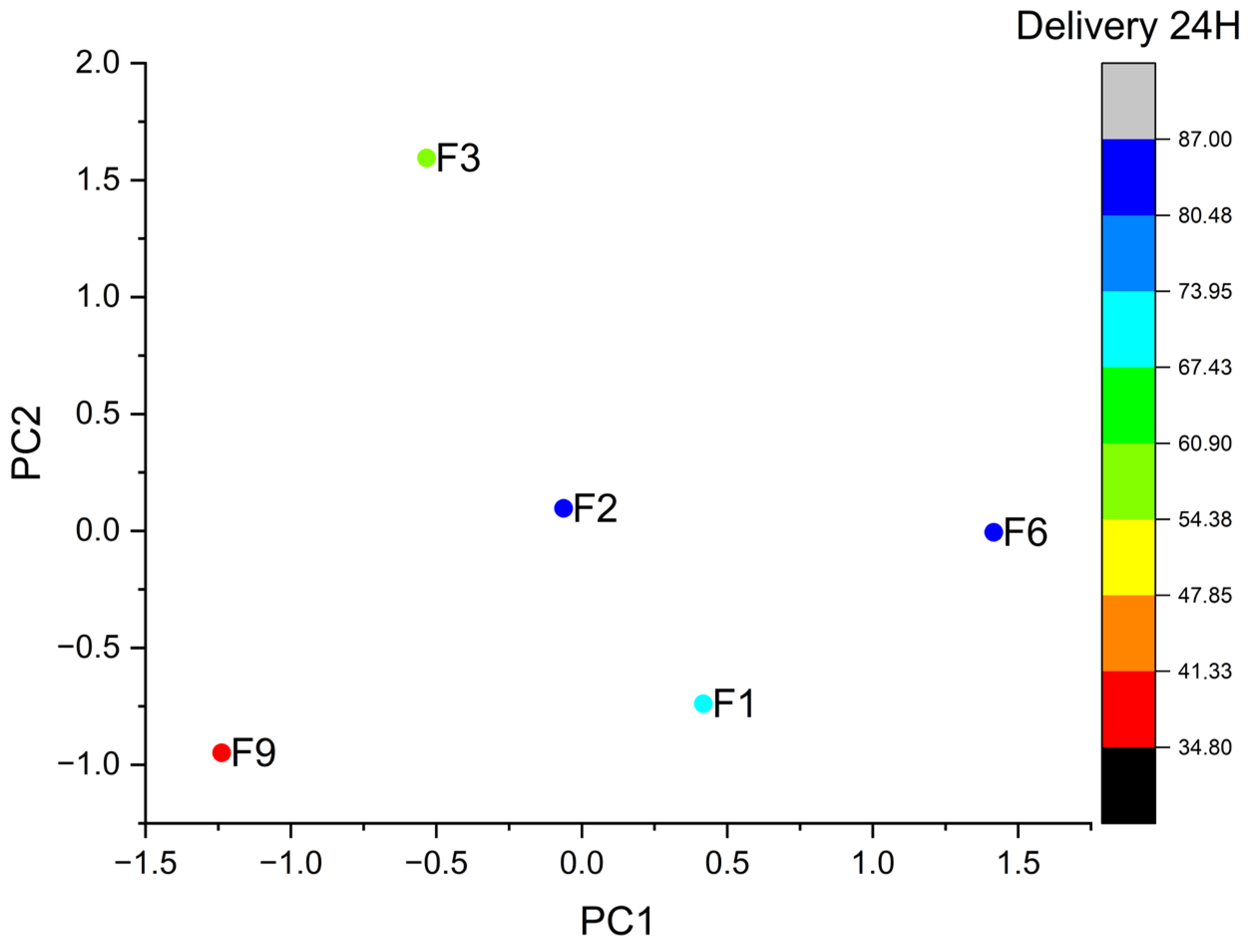 3.7. Multivariate Statistical Analysis of Formulation Performance (PCA and K-Means Clustering)