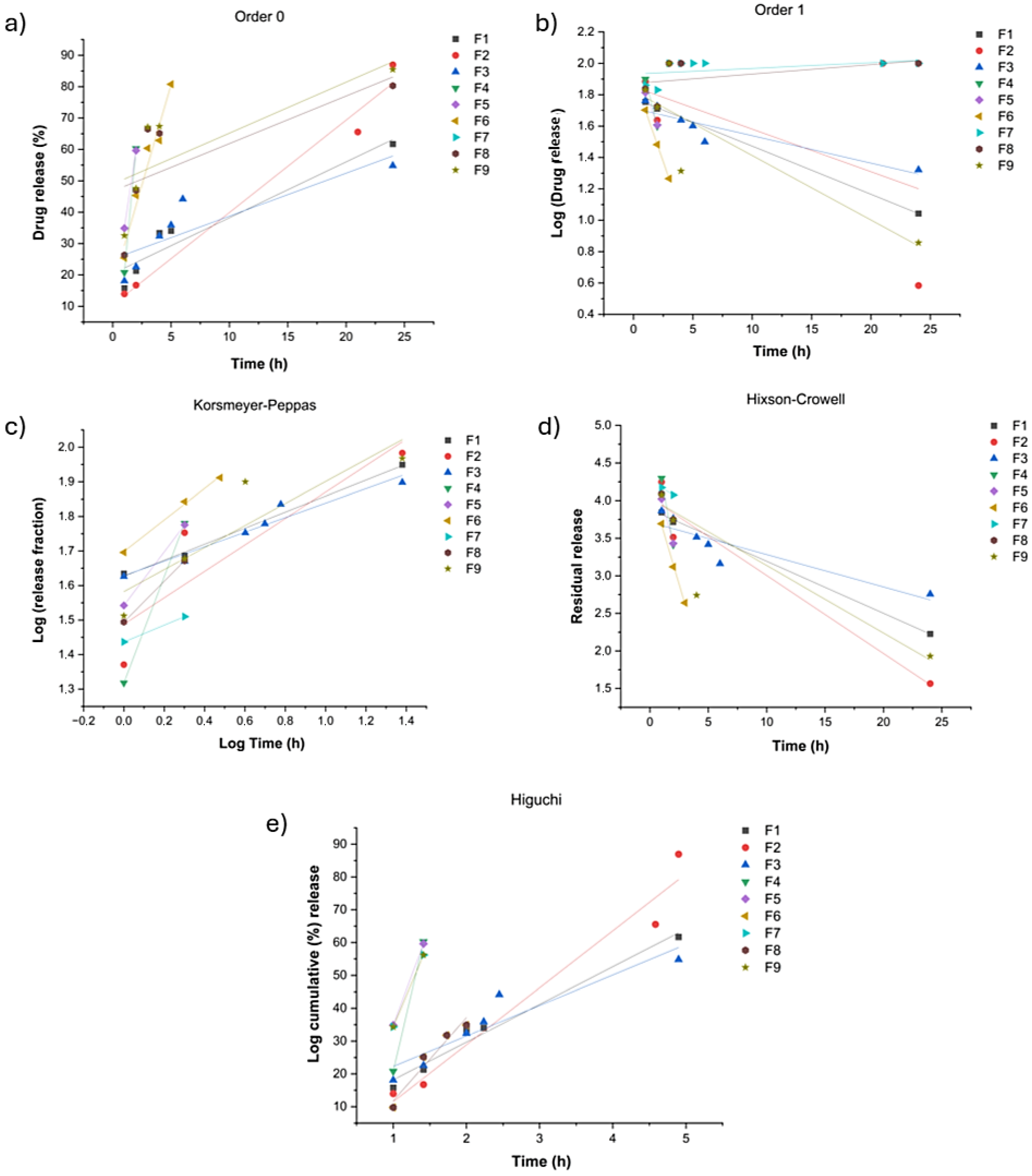 | Formulation | Zero-Order Kinetics | First-Order Kinetics | Higuchi | Hixson–Crowell | Korsmeyer–Peppas | |||||