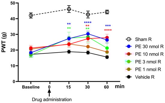 The acute antiallodynic effect of intrathecally administered PE at the following doses: 1, 3, 10, and 30 nmol/rat was tested in rats exhibiting significant tactile allodynia, on day 14 after pSNL (Figure 1). PE in doses of 3, 10, and 30 nmol/rat produced a significant antiallodynic effect at 30 min following administration. Notably, PE at a dose of 30 nmol produced a significant antiallodynic impact at every time point and peaked at 30 min after administration. Therefore, this dose was used for further investigations. Given the potential for changes in the central nervous system in chronic pain that may affect PWTs on both sides, the contralateral side was not utilized as a control to rigorously eliminate this bias. Therefore, the PWTs of the right paws of animals that underwent pSNL and displayed tactile allodynia were used to measure the impact of the vehicle.