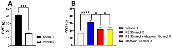 (A) The two-tailed t-test with the Mann–Whitney test was used to compare the pain threshold between the sham-operated R and the vehicle R group (Mann–Whitney test, U = 0, p = 0.0003). (B) The acute antiallodynic effects of intrathecal PE (30 nmol/rat) alone or in the presence of 10 nmol/rat idazoxan in rats on day 14 after pSNL. The PWTs were measured 30 min after administration of the test compounds. Data are expressed as mean ± SEM, n = 5–12 per group. The PWTs were compared using one-way ANOVA with Tukey’s post hoc test (* p < 0.05, *** p < 0.001,**** p < 0.0001), F = 10.33. Number of rats used per group: sham (n = 5), vehicle (n = 12), 30 nmol PE (n = 6), 30 nmol PE + 10 nmol idazoxan (n = 5), and 10 nmol idazoxan (n = 6).