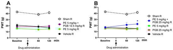 The antiallodynic effect of PE (5 mg/kg), PE/PGB (5 mg + 12.5 mg/kg), and vehicle (A); PE (5 mg/kg), PGB (25 mg/kg), PE/PGB (5 mg + 25 mg/kg), and vehicle (B) on pSNL-induced allodynia in rats after acute oral administration. The PWTs were measured on day 14 after pSNL at 60 and 120 min following oral administration. Data are given as mean ± SEM, n = 5–6 per group. The PWTs were compared before and after treatment (two-way ANOVA F (8, 69) = 1.097; Dunnett’s post hoc test, * p < 0.05 statistically significant compared to the vehicle-treated right (R) operated hind paw.