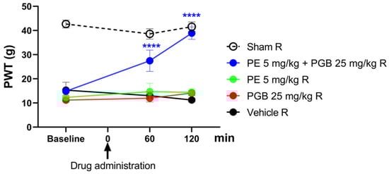 The effect of the combination of PE (5 mg/kg) and PGB (12.5 or 25 mg/kg) administered orally was investigated in rats that developed allodynia on day 14 after pSNL (Figure 4A,B). The combination of 5 mg PE and 12.5 mg PGB failed to produce an antiallodynic effect (Figure 4A). On the other hand, the 5 mg PE and 25 mg PGB combination significantly alleviated the tactile allodynia of rats with NP at 120 min (Figure 4B) after acute oral administration compared to the vehicle. In contrast, neither PE nor PGB alone had an effect, as shown at the measurement time points (Figure 4B). The 5 mg PE and 25 mg PGB combination is investigated further in Section 3.5.