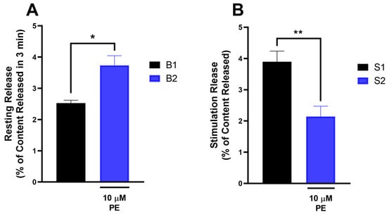 The effect of PE on the resting (A) and electrical stimulation-evoked (B) [3H]NA release in the mouse spinal cord. Data are expressed as mean ± SEM, n = 6 per group. (A) In case of resting release, fractional release was compared with and without PE (two-tailed t-test, t = 3.105, df = 5, with a 95% confidence interval from 0.2080 to 2.208). The effect size, as measured by partial eta squared, was 0.6585, indicating a large effect. * p < 0.05 statistically significant. The fractional stimulated release (B) was compared with and without PE (Paired two-tailed t-test, t = 5.564, df = 5, with a 95% confidence interval from −2.56 to −0.94). The effect size, as measured by partial eta squared, was 0.861, indicating a large effect. ** p < 0.01 statistically significant.
