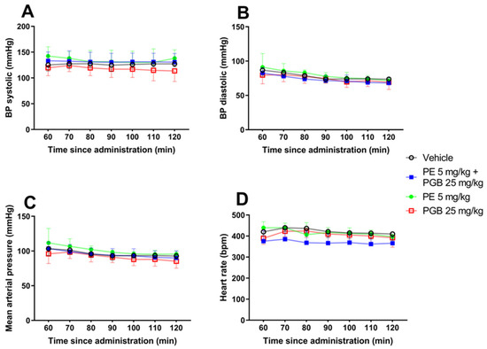 Blood pressure analysis after acute oral administration of 5 mg/kg PE, 25 mg/kg PGB, or 5 mg/kg PE + 25 mg/kg PGB was carried out. Animals were anesthetized with isoflurane, and the right carotid artery was cannulated to measure blood pressure. No significant difference was observed between the treatment groups at different time points from 60 to 120 min: (A) systolic blood pressure, (B) diastolic blood pressure, (C) mean arterial pressure and (D) heart rate (Figure 10).