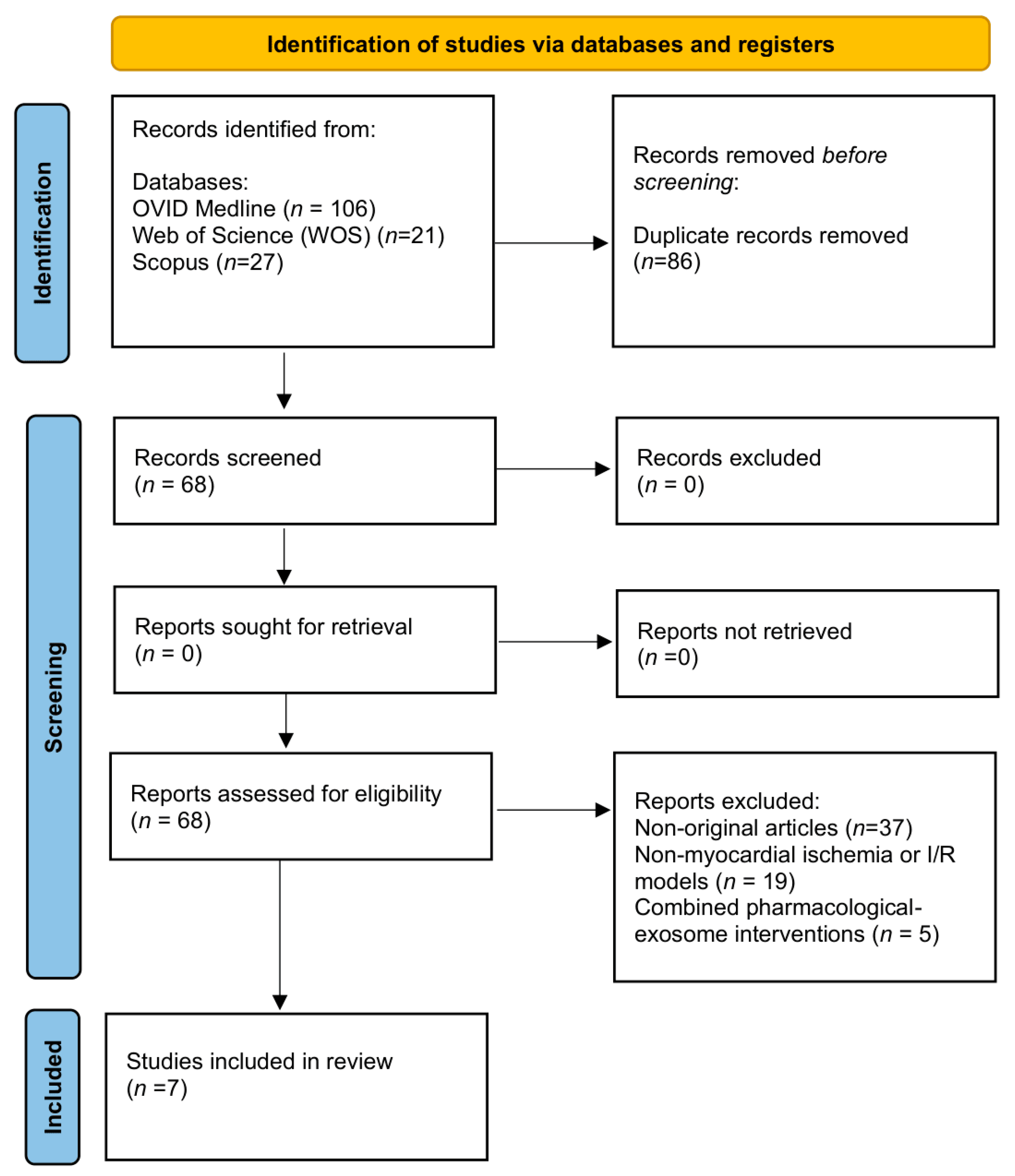 - Othman Basri, N.A.; Ugusman, A.; Aminuddin, A.; Hamid, A.A.; Hui, C.K.; Che Roos, N.A.; Mahadi, M.K. The Role of Mesenchymal Stem Cell-Derived Exosomes in Treating Myocardial Ischemia/Reperfusion Injury: A Systematic Review Protocol. Adv. Hum. Biol. 2024, 15, 323–327. [Google Scholar] [CrossRef]