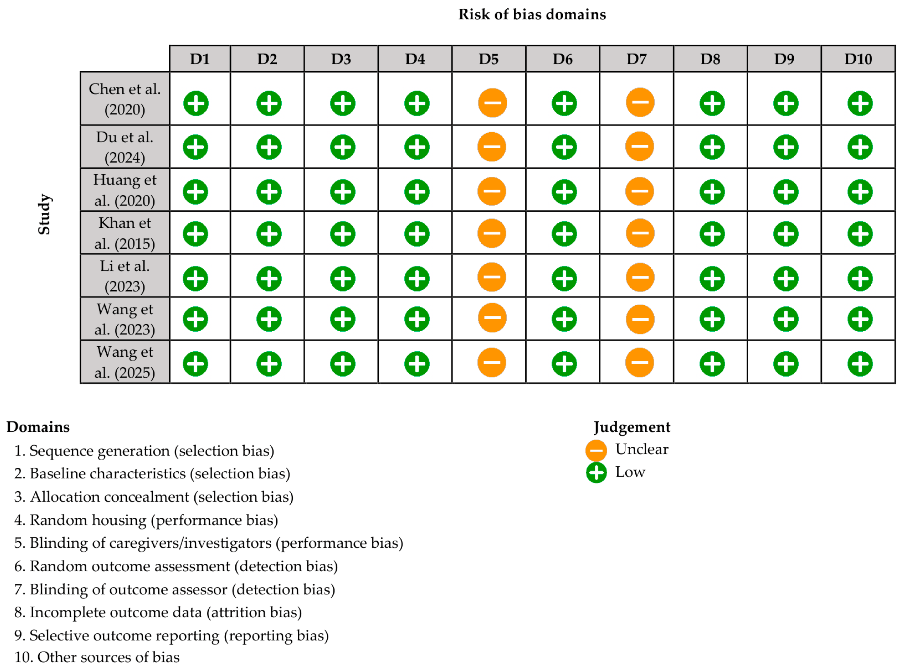 - Hooijmans, C.R.; Rovers, M.M.; de Vries, R.B.; Leenaars, M.; Ritskes-Hoitinga, M.; Langendam, M.W. SYRCLE’s Risk of Bias Tool for Animal Studies. BMC Med. Res. Methodol. 2014, 14, 43. [Google Scholar] [CrossRef] [PubMed]