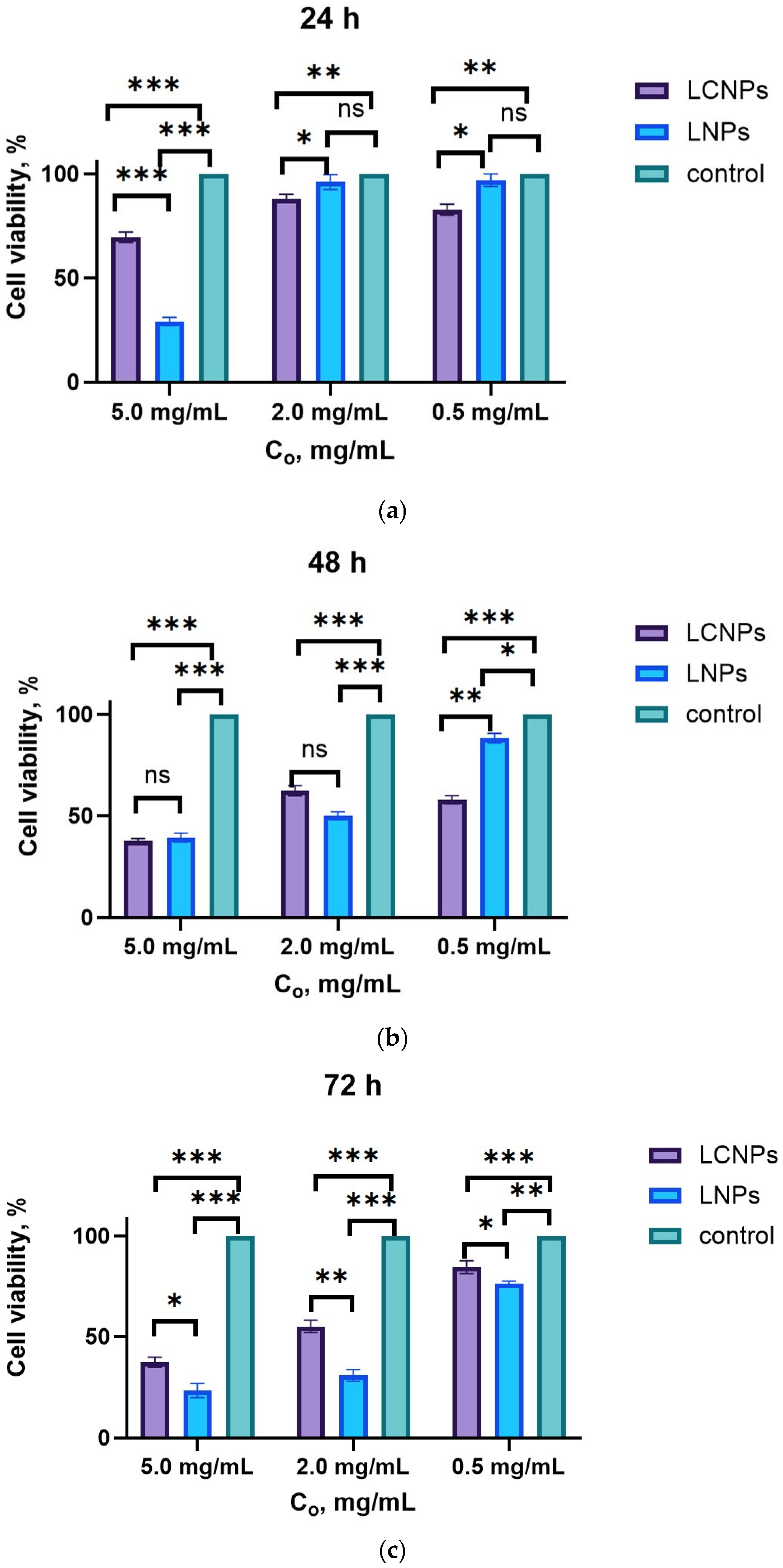 The cytotoxicity of LCNPs) and LNPs was assessed across three concentrations (5.0, 2.0, and 0.5 mg/mL) and three exposure periods (24, 48, and 72 h) (