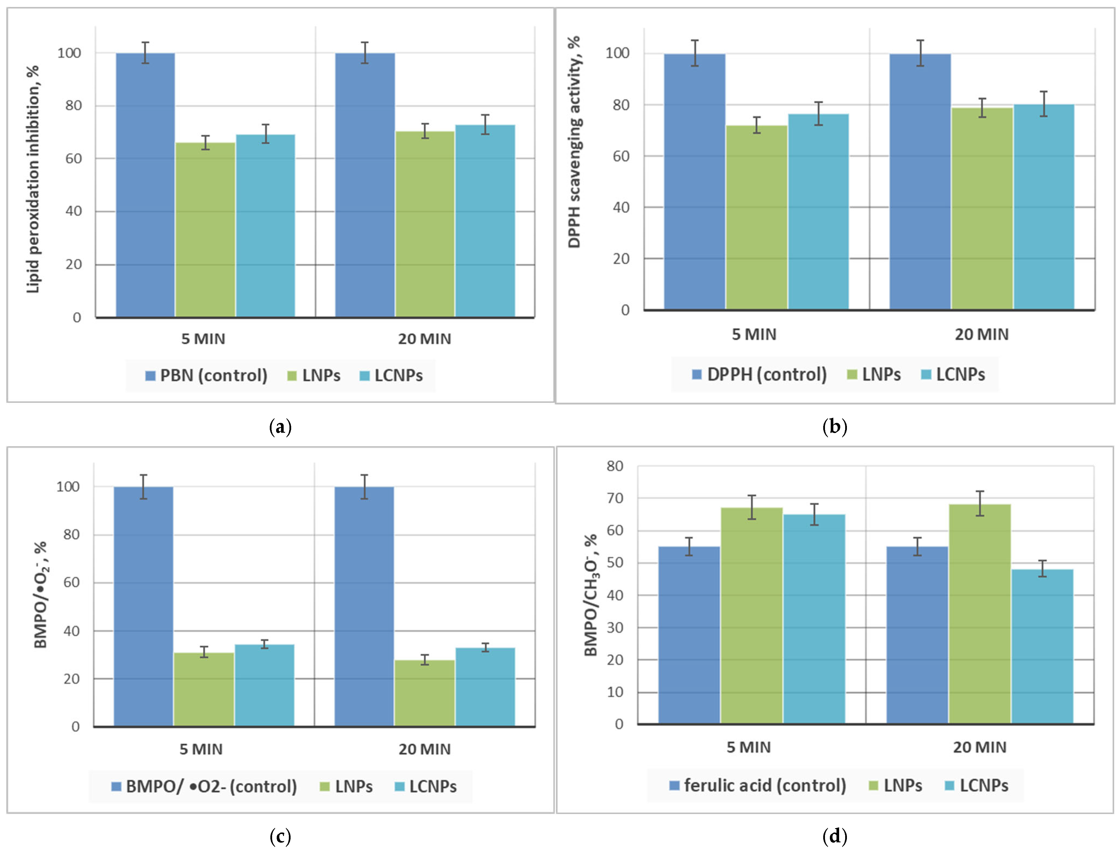 48]. Both nanoformulations demonstrated substantial inhibition of lipid peroxidation (at 5 min: 66.1% and 69.3%, respectively; at 20 min: 70.5% and 72.8%, respectively) compared to the spin trap PBN (100%). The slightly higher activity of LCNPs suggests that chitosan incorporation enhances interaction with lipid radicals, possibly via electrostatic stabilization or improved dispersion in the lipid environment. With respect to DPPH radical scavenging, LNPs exhibited 72.1% and 78.9% inhibition at 5 and 20 min, respectively, while LCNPs displayed 76.5% and 80.4% activity. These results confirm that both nanoparticle types possess strong hydrogen- or electron-donating capacity, with LCNPs slightly superior at early time points, probably due to synergistic effects between the conjugated biopolymers lignin and chitosan. According to modern scientific literature, the DPPH assay is influenced by various molecular structural characteristics, and the radical scavenging potential of polyphenolic compounds depends on the number and position of aliphatic/aromatic -OH groups as well as the presence of other substituents and functional groups [
