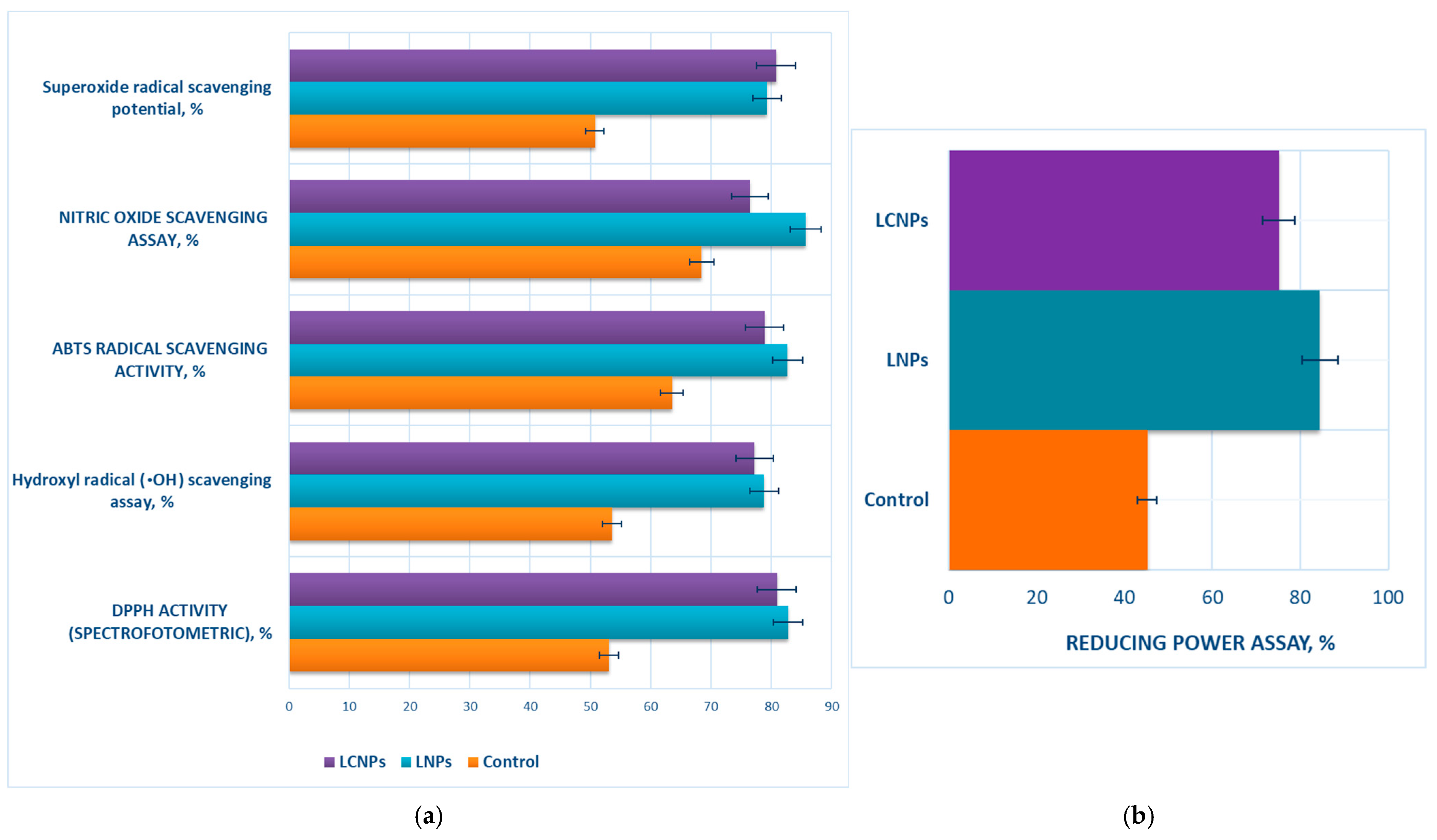 EPR spectroscopy was employed to evaluate the radical-scavenging potential of LNPs and LCNPs against lipid peroxidation, DPPH radicals, superoxide (