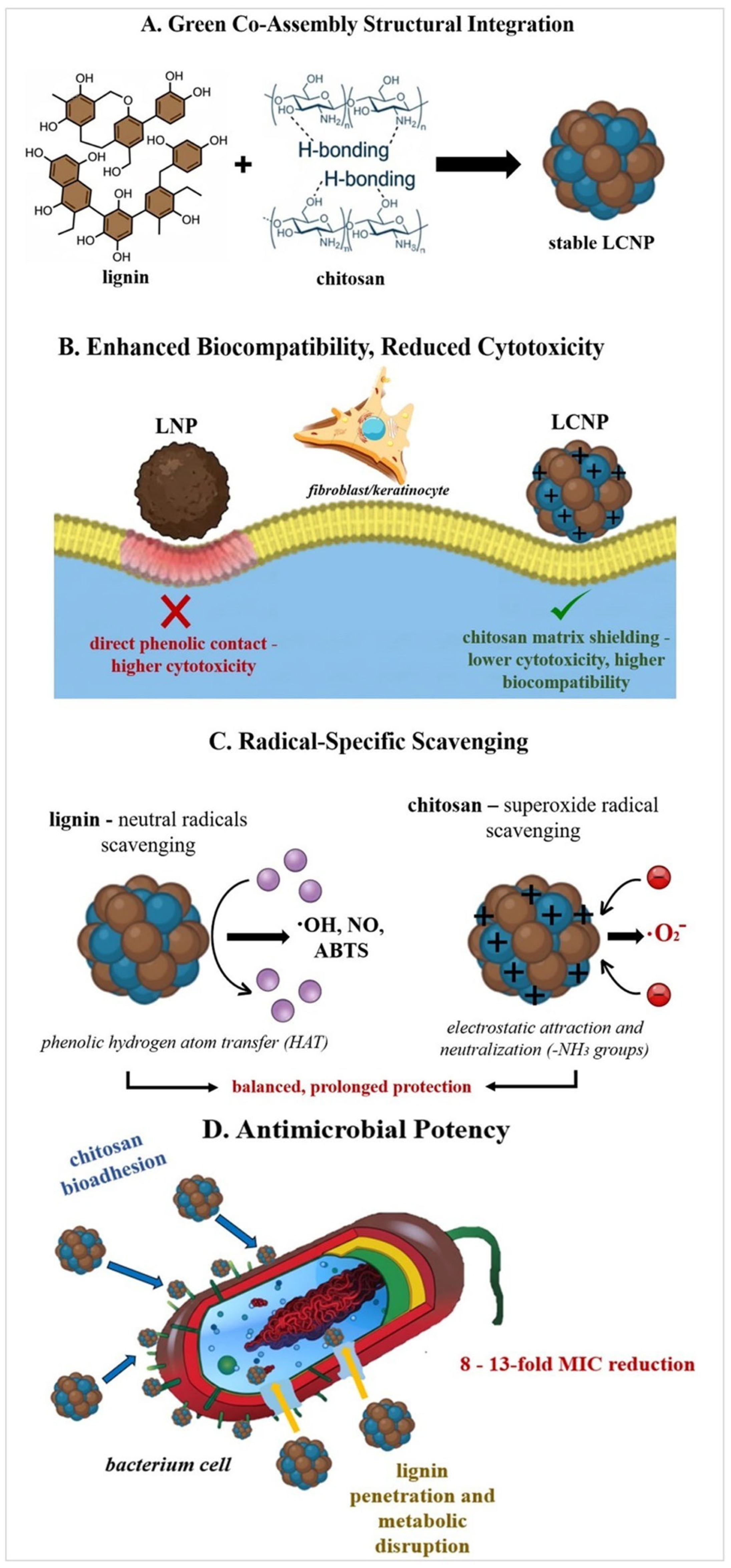 •OH) and nitric oxide (NO) radical scavenging activity, with LNPs outperforming LNCPs. These results confirm the assumption that lignin phenolic groups dominate over the neutralization of highly reactive radicals, while chitosan probably partially shields these functional groups.