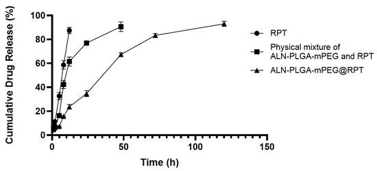 In vitro release characteristics of the drug-loaded micelles were investigated using dynamic dialysis. ALN-PLGA-mPEG@RPT, free RPT, and a physical mixture of ALN-PLGA-mPEG and RPT (containing an equivalent amount of RPT) were separately placed into dialysis bags (MWCO: 3.5 kDa). The bags were immersed in 100 mL of phosphate-buffered saline (PBS, pH 7.4) as the release medium and incubated in a full-color touch-screen dual-stack shaker (Model ZWYR-D2402, Shanghai Zhicheng Analytical Instrument Manufacturing Co., Ltd., Shanghai, China) under constant agitation (37 ± 0.5 °C, 100 rpm). The physical mixture control was included to confirm successful drug encapsulation and to evaluate the influence of micellar entrapment on the release behavior of RPT. Samples (1 mL) were withdrawn at predetermined time points (1, 2, 5, 8, 12, 24, 48, 72, and 120 h), and an equal volume of pre-warmed PBS was immediately replenished. All samples were filtered through a 0.22 μm microporous membrane prior to quantitative analysis of RPT content via HPLC. Each experiment was performed in triplicate, and data are presented as mean ± standard deviation. The cumulative release of RPT was calculated according to the following formula:
