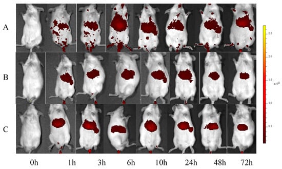 Fluorescence scan results of fluorescent nanomicelles using a small animal in vivo imaging system. (A) ALN-PLGA-mPEG fluorescent micelle group; (B) mPEG-PLGA fluorescent micelle group; (C) Free DIR group.