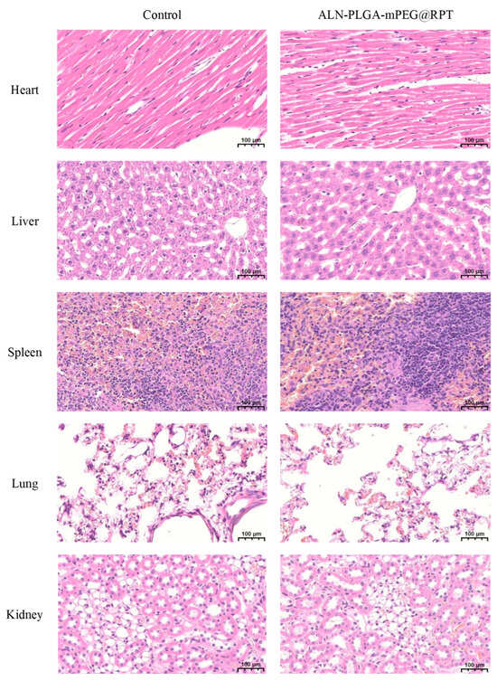 Histopathological evaluation of major organs (heart, spleen, lung, kidney, and liver) from SD rats was performed via H&E staining at 48 h post-administration. Compared with the saline control group, the ALN-PLGA-mPEG@RPT nanomicelle-treated group showed no discernible morphological alterations, necrosis, or signs of inflammation in any of the examined organs (Figure 6). These findings indicate favorable biocompatibility of ALN-PLGA-mPEG@RPT at the administered dose. Furthermore, PLGA—a biodegradable polymer approved by both the FDA and EMA for use in medical formulations—possesses a well-established safety profile. Its degradation products, lactic acid and glycolic acid, are metabolically eliminated from the body [42,43,44]. Nevertheless, further long-term toxicity studies remain warranted to comprehensively assess its safety.