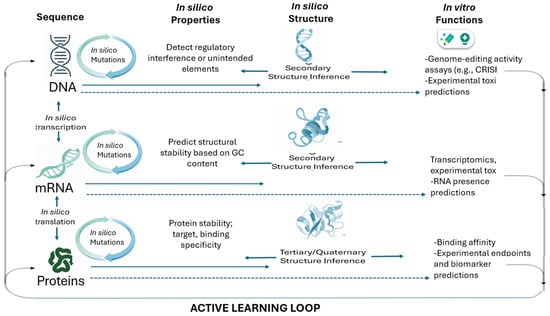 Figure 1 illustrates a continuous, AI-enabled learning loop that replaces traditional linear, trial-and-error therapeutic design with an iterative, data-driven process. Rooted in the central dogma of molecular biology, computational models simulate how modifications at the DNA level propagate to mRNA and protein, enabling large-scale in silico mutation, structural prediction, and functional forecasting before laboratory experimentation. AI systems evaluate properties such as regulatory elements, RNA stability, protein folding, binding affinity, and potential toxicity, effectively conducting rapid virtual prototyping across molecular layers. Experimental in vitro results, including genome-editing efficiency, transcriptomic profiles, and protein functionality, are then fed back into the models, refining their predictive accuracy through active learning. This closed-loop architecture accelerates discovery, reduces experimental burden, and enhances safety by identifying suboptimal or high-risk candidates early in development, representing a more efficient and adaptive paradigm for CGT research.