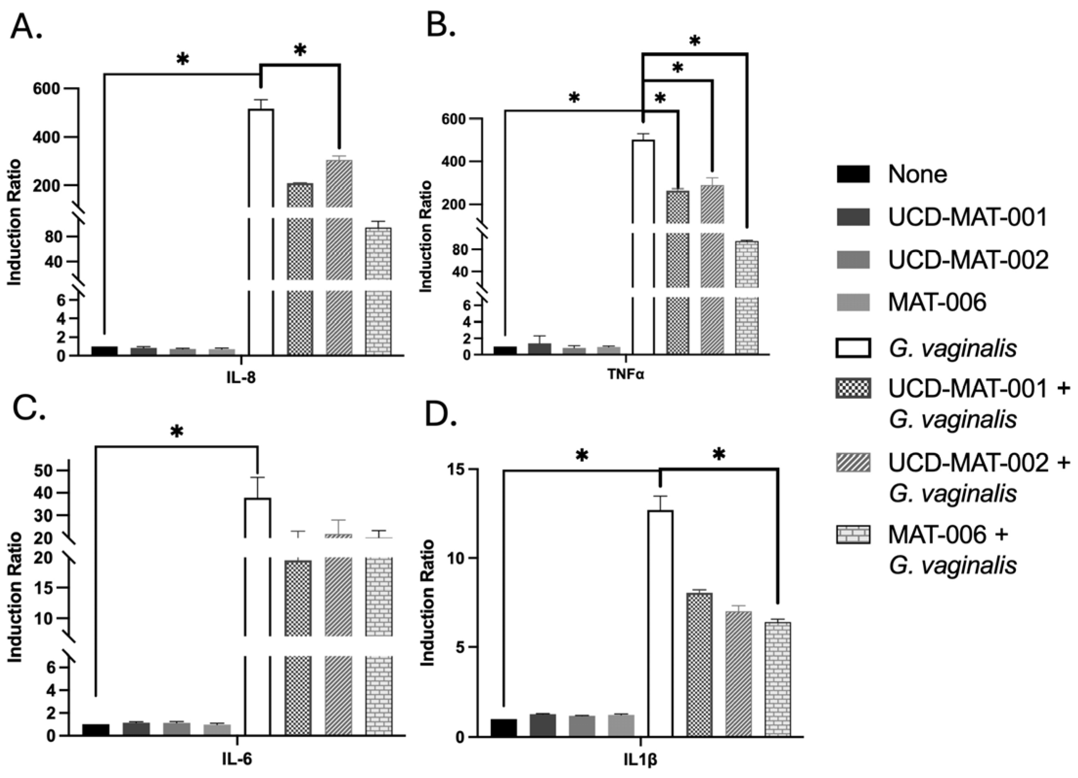 3.6. Impact on Inflammation During an In Vitro Infection Assay with G. vaginalis