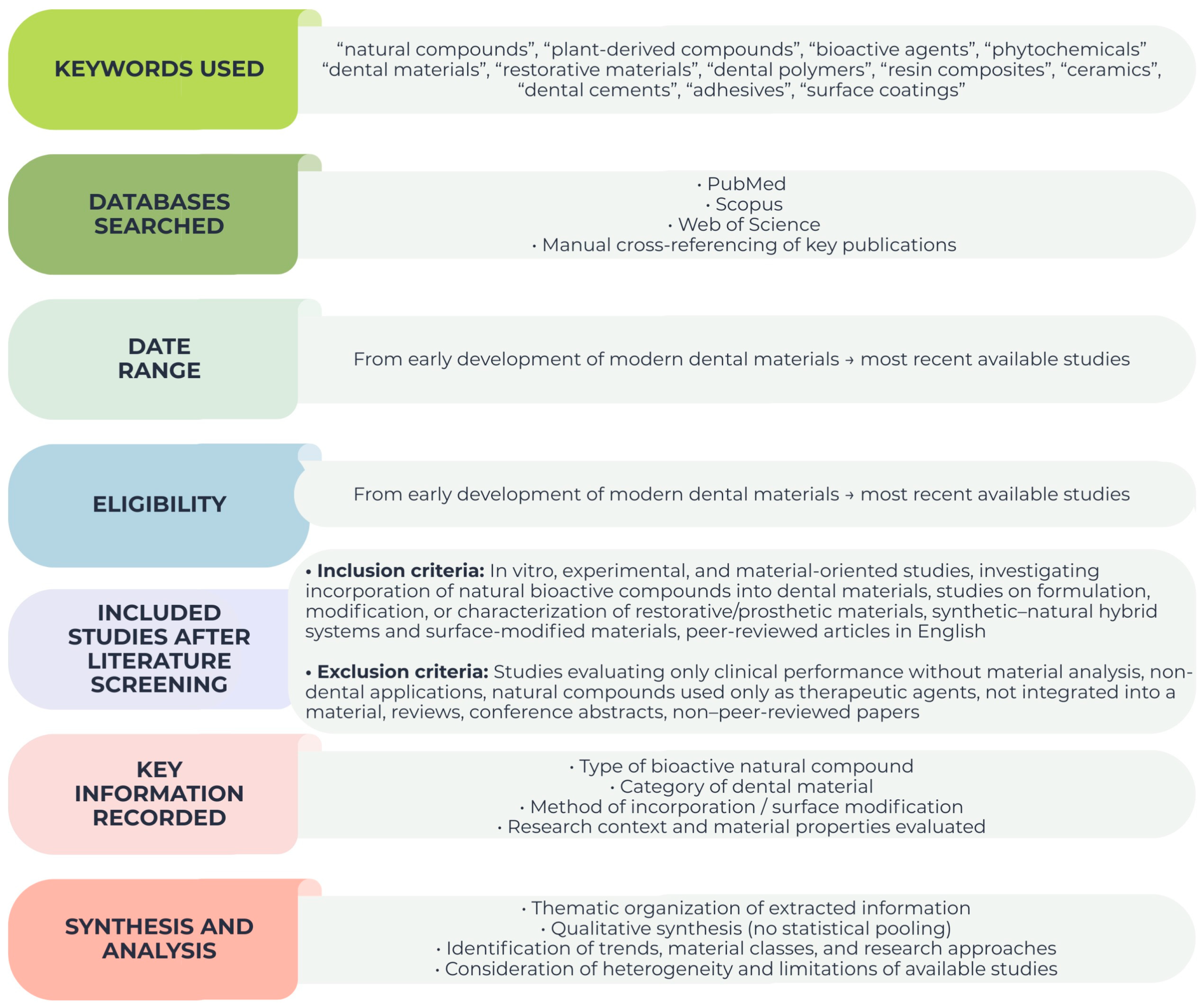 - De Angelis, F.; Minnoni, A.; Vitalone, L.M.; Carluccio, F.; Vadini, M.; Paolantonio, M.; D’Arcangelo, C. Meta-Analytical Evaluation of Components Released from Resin-Based Dental Composites. Clin. Oral Investig. 2022, 26, 4639–4654. [Google Scholar] [CrossRef] [PubMed]