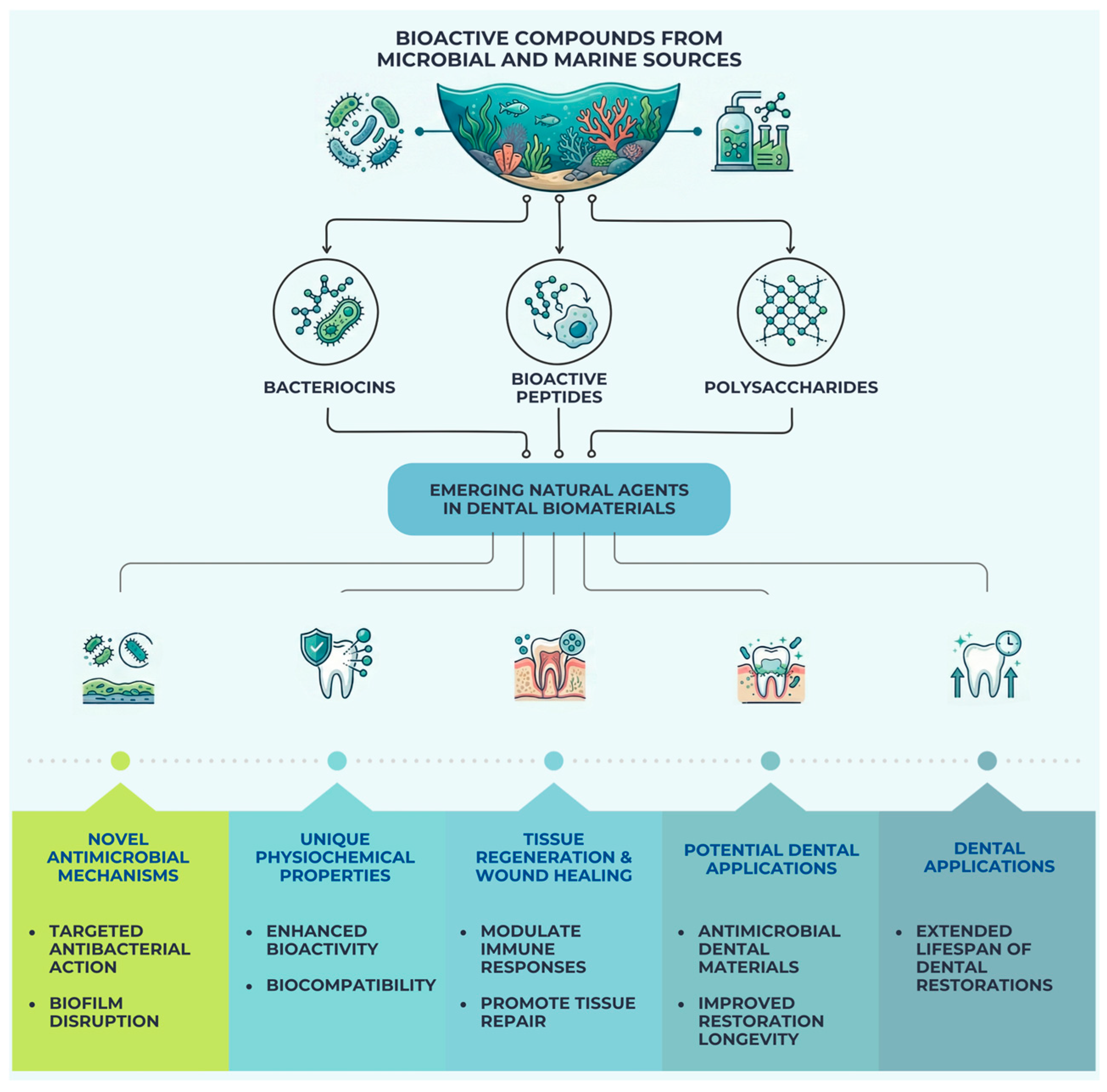 - Paczkowska-Walendowska, M.; Kulawik, M.; Kwiatek, J.; Bikiaris, D.; Cielecka-Piontek, J. Novel Applications of Natural Biomaterials in Dentistry—Properties, Uses, and Development Perspectives. Materials 2025, 18, 2124. [Google Scholar] [CrossRef]