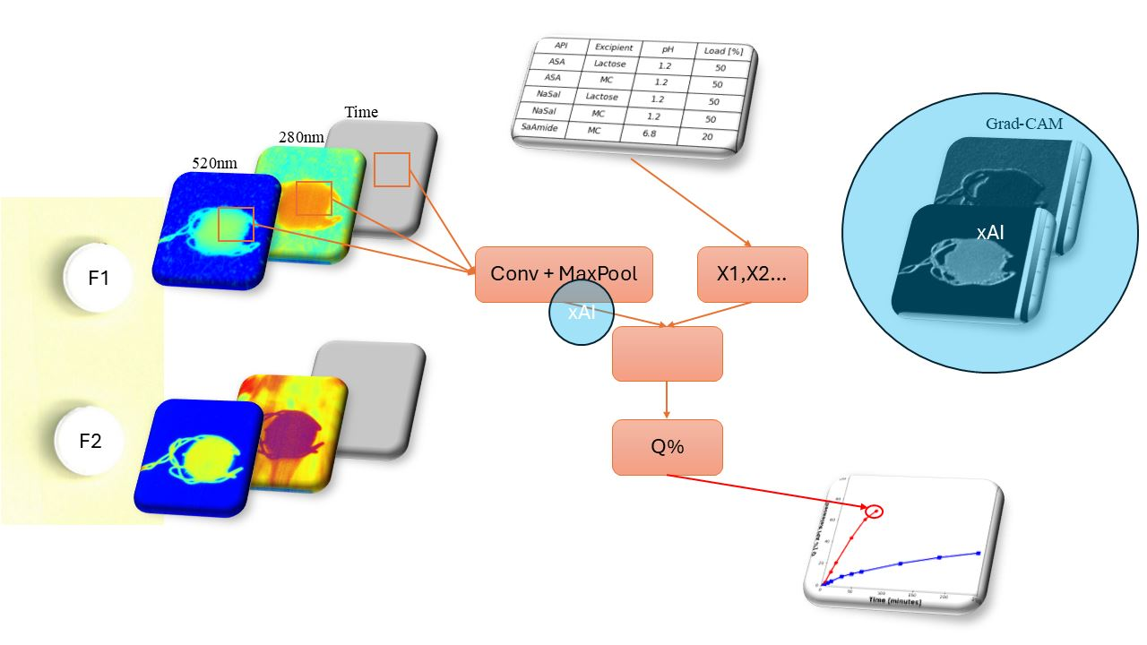 This study presents a framework combining SDi2 with a multimodal CNN to predict and interpret dissolution behavior of oral solid dosage forms. Our work achieved its threefold objective: first, to develop a multimodal CNN framework for predicting API release from SDi2 imaging data; second, to apply Grad-CAM to decode the CNN’s decision-making process, thereby correlating its predictions with tangible physicochemical mechanisms like gel layer formation and surface erosion; and third, to leverage these integrated insights for a more informed approach to formulation optimization. The resulting final model, which integrated dual-wavelength images with temporal and formulation data, achieved competitive performance (R2 = 0.89, RMSE = 11.57), demonstrating generalization to unseen data. Crucially, the use of Grad-CAM highlighted which regions of the tablet surface or core dominated the release behavior (e.g., edge erosion for lactose vs. gel-layer thickening for MC), suggesting that explainable AI can help formulation scientists identify which structural features most influence dissolution and therefore guide excipient selection and matrix design. Key findings confirmed that the model learned to recognize how excipients like lactose and methylcellulose alter release kinetics, with MC formulations exhibiting sustained release due to gel layer formation. The framework also effectively captured how APIs with pH-dependent solubility, such as ASA, produce variable release profiles in different compendial media. This level of discernment was made possible by the dual-wavelength approach, which simultaneously captures both surface API release and bulk structural phenomena, enabling far more accurate predictions than could be achieved with single-wavelength methods. By integrating real-time imaging with explainable AI, this study provides a proof-of-concept framework for data-driven dissolution analysis, suggesting potential utility in formulation screening and early-stage development. However, broader applicability will require validation on larger and more chemically diverse datasets, encompassing a wider range of APIs, excipients, and dosage form designs, before generalizing the findings to real-world pharmaceutical development contexts.