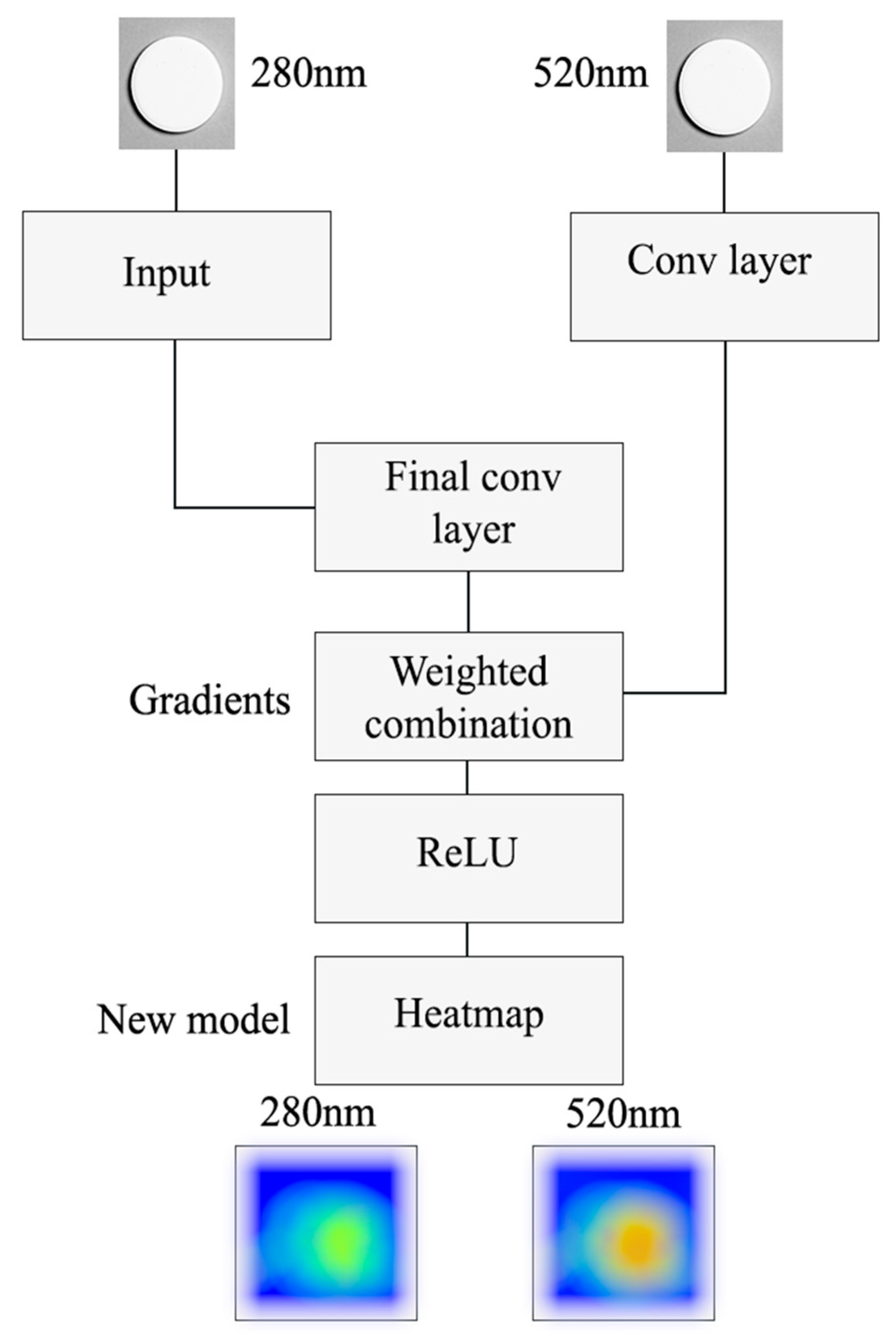 26]. Gradients of the predicted Q% value were extracted with respect to the final convolutional layer of each image branch (280 nm and 520 nm, respectively), and global average pooling was applied to obtain channel-specific importance weights. The resulting heatmaps were superimposed on the original SDi2 images for visualization (OpenCV v4.8.0, α = 0.5) [