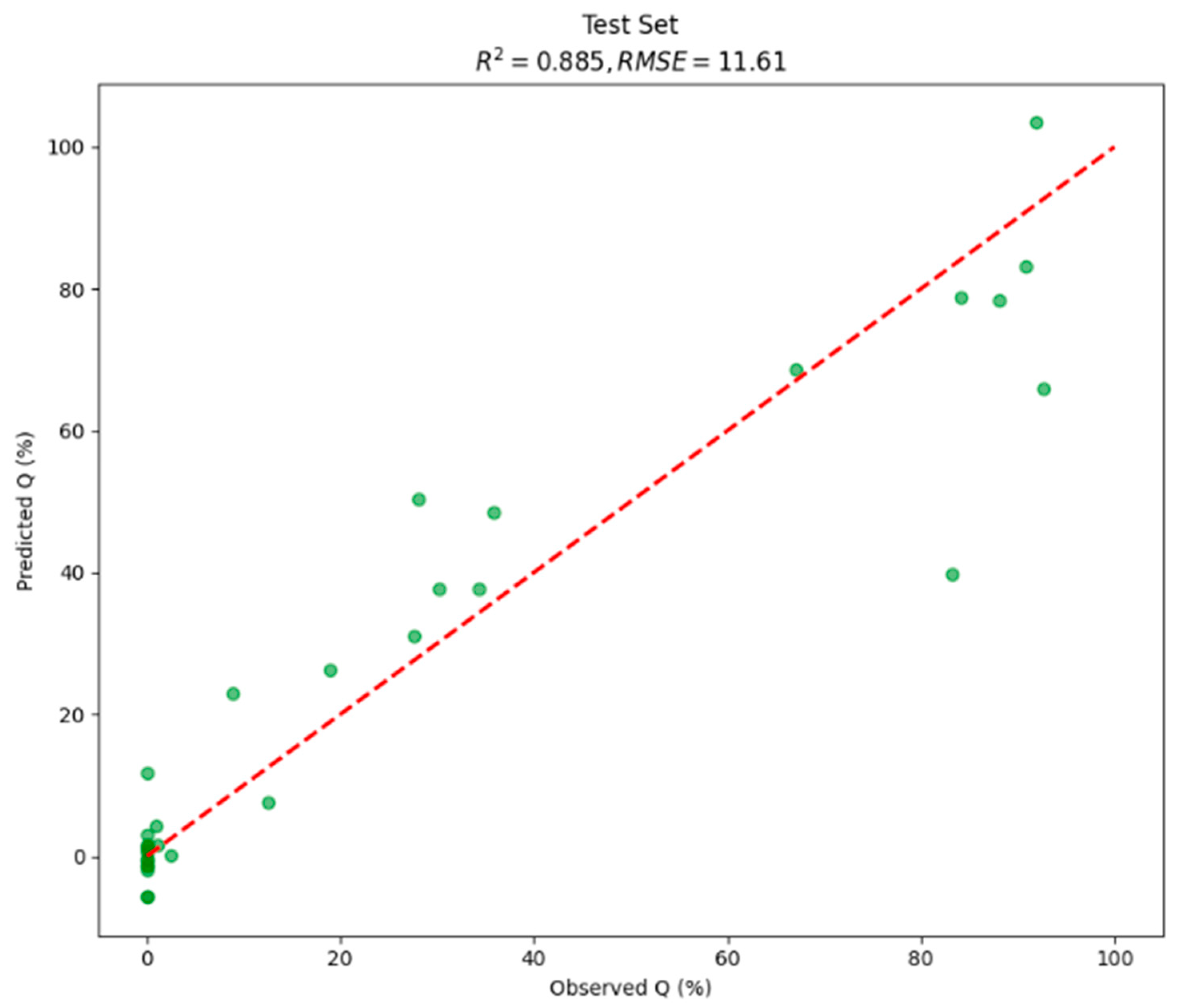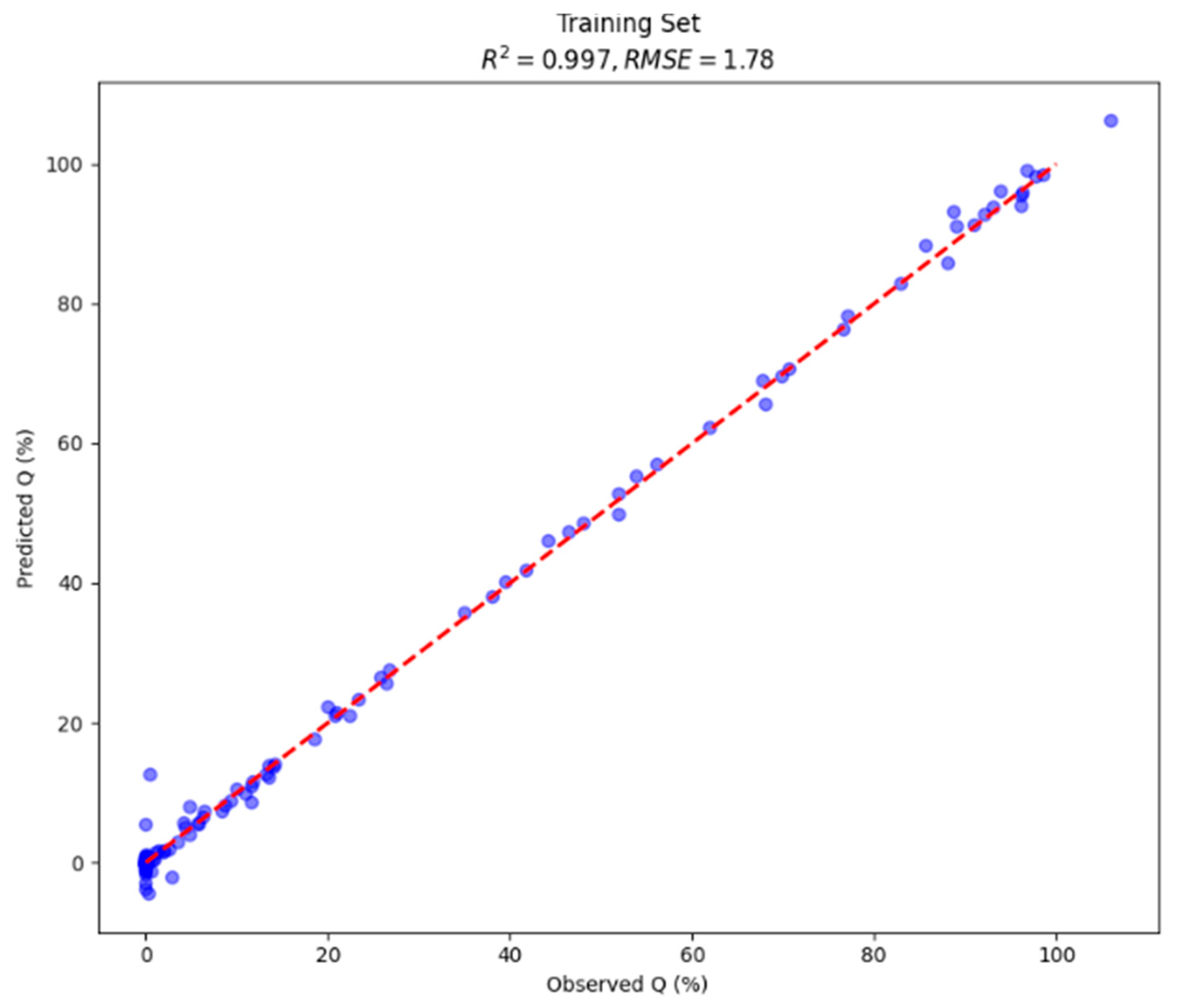To evaluate the predictive accuracy of the final multimodal CNN, model-predicted Q% values were compared against reference UV-Vis measurements on both the training set and the held-out test set.