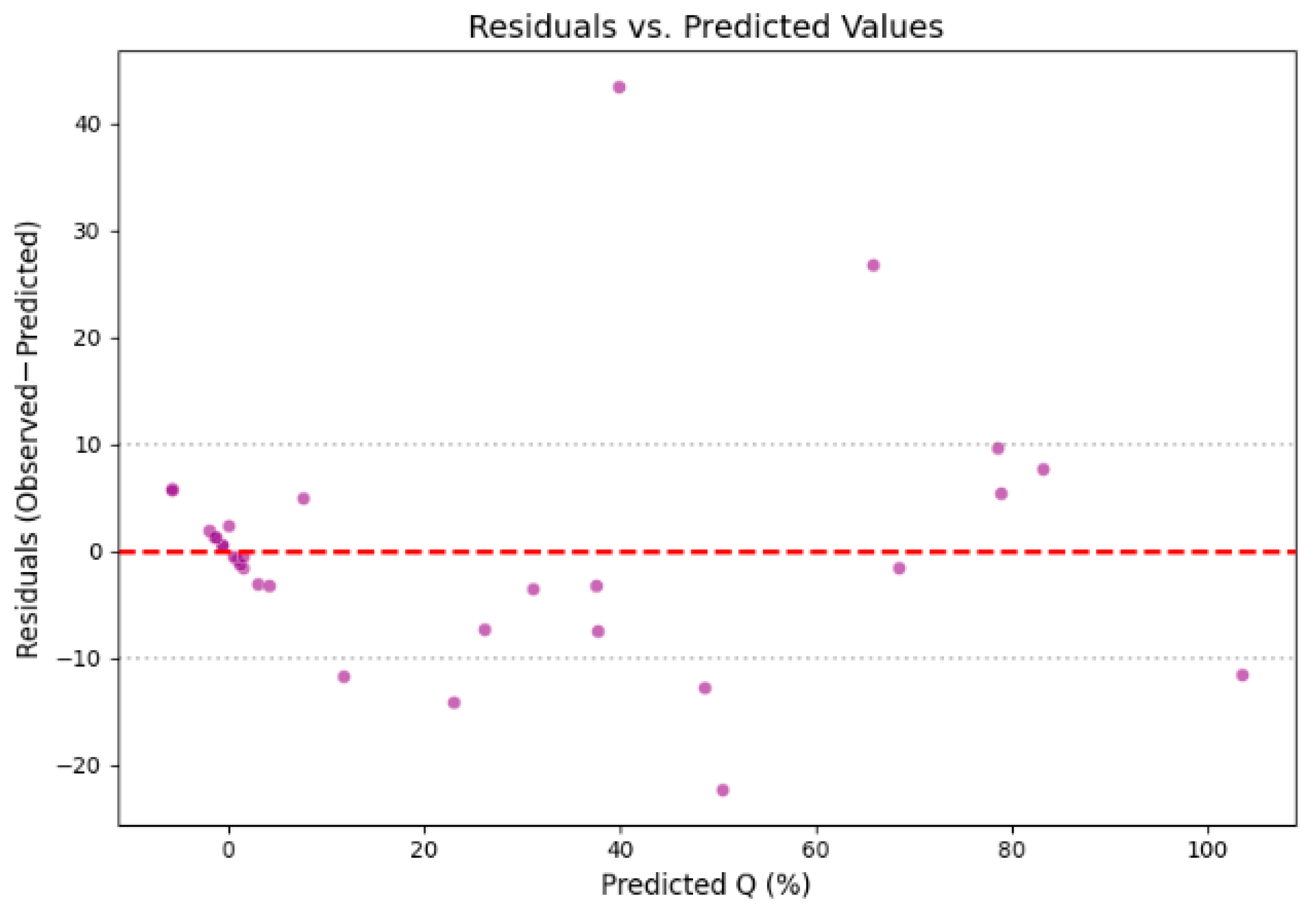 Moreover, stratified analysis performed within the existing held-out test set (n = 31; pH 1.2: n = 16, pH 6.8: n = 15) revealed R2 = 0.957 and RMSE = 7.21% at pH 1.2 and R2 = 0.804 and RMSE = 14.94% at pH 6.8. For reference, a linear regression model trained on an identical data split using dissolution time and one-hot encoded formulation composition as inputs achieved R2 = 0.278 and RMSE = 29.14% on the test set.