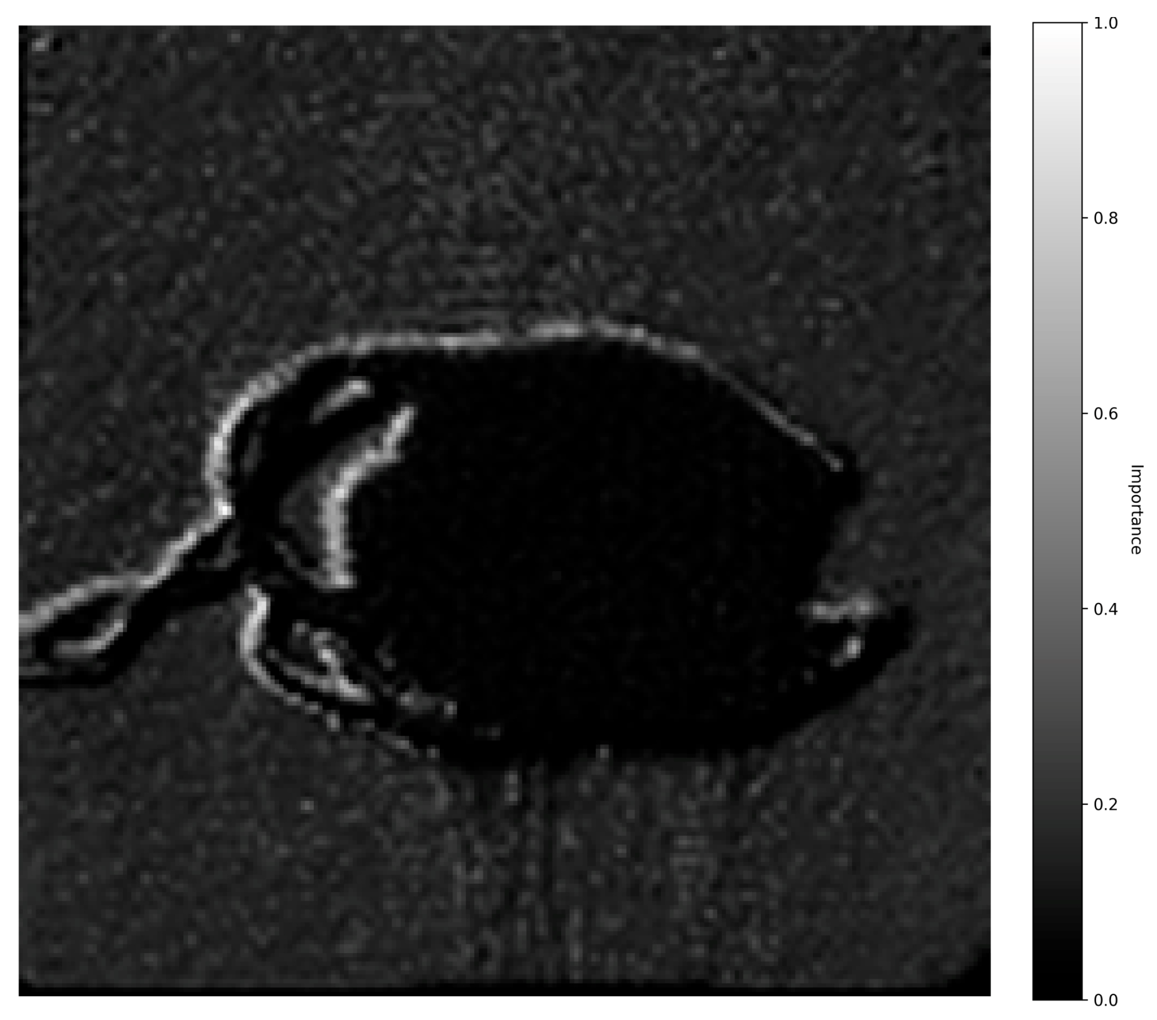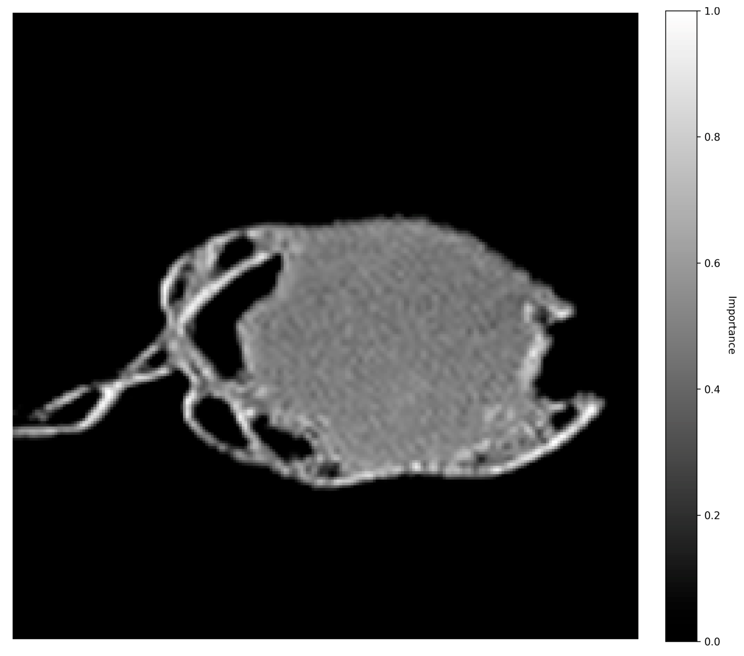 Figure 8 represent gradient-based saliency maps of the CNN, where the ‘importance’ axis quantifies the gradient-weighted contribution of each pixel to the model’s prediction of dissolved API percentage (Q%). Notably, activation was also observed on the stainless-steel tablet holder visible in the images. While the mechanistic basis of this activation requires further investigation, it may reflect the model using the static bracket as a spatial reference against which tablet boundary changes are implicitly quantified. Overall, the Grad-CAM activation patterns are presented as model-transparency findings confirming that the CNN attends to physically plausible image regions. The 520 nm core activations are qualitatively consistent with the established role of the visible channel in detecting matrix structural changes through refractive index contrast [