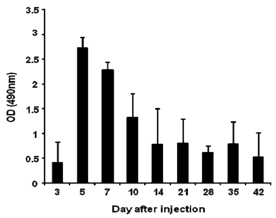 Anti-PEG IgM production was detected in mice following a single intravenous injection of PEGylated liposomes at a dose of 1 μmol PL/kg (Figure 1). The level of anti-PEG IgM in serum began to increase at day 3, peaked at day 5, and then gradually decreased. This finding is consistent with earlier results using rats [14].