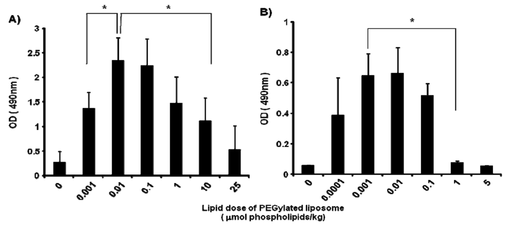 In mice, the anti-PEG IgM production at day 5 after injection was affected by the lipid dose of PEGylated liposomes (0, 0.001, 0.01, 0.1, 1, 10 and 25 μmol PL/kg) (Figure 2A). The level of anti-PEG IgM production was increased as the lipid dose was increased to 0.01 μmol PL/kg and decreased as the lipid dose was increased further. A similar tendency for anti-PEG IgM production was observed in rats (Figure 2B); the level increased as the lipid dose increased to 0.001 μmol PL/kg and decreased with further increases in the lipid dose. The rats appeared to be somewhat more sensitive than the mice to the PEGylated liposomes.