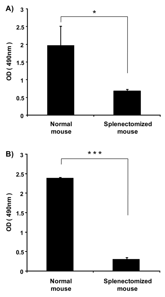 Previously, we showed that the spleen plays an important role in the induction of the ABC phenomenon in rats [8]. However, there was no direct evidence to indicate that the spleen contributes to the production of anti-PEG IgM in mice and rats. Here, we investigated the effect of splenectomy (removal of the spleen) on anti-PEG IgM production in mice and rats. Anti-PEG IgM production was obvious in normal mice that were used as the positive control, while the production was significantly reduced in splenectomized mice (Figure 3A). A similar reduction of anti-PEG IgM was observed in splenectomized rats, compared to normal rats (Figure 3B). These results suggest that the spleen is a major organ involved in the secretion of anti-PEG IgM in mice and rats.
