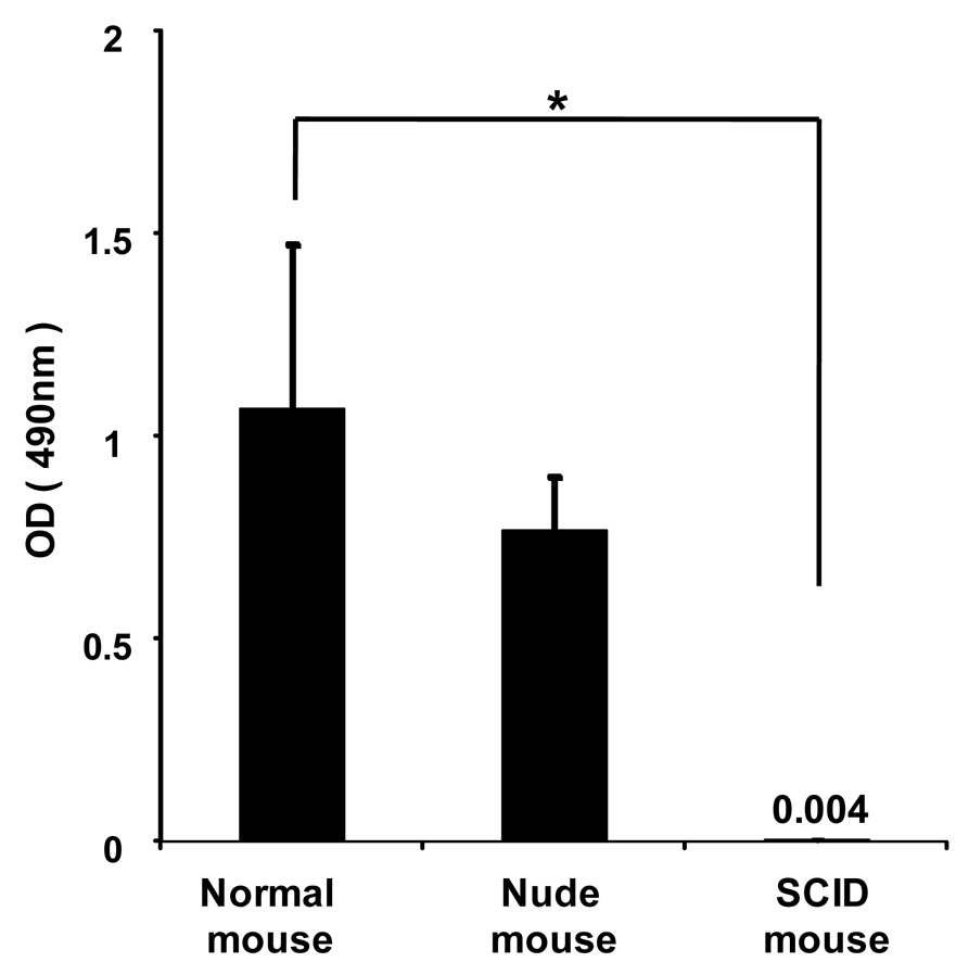 To investigate whether anti-PEG IgM is secreted from B-cells without the help of T-cells, PEGylated liposomes were intravenously injected into immunodeficient athymic (nude) mice that were B-cell deficient and severe combined immunodeficient (SCID) mice that were B- and T-cell deficient. In the normal mice, PEGylated liposomes caused the production of anti-PEG IgM (Figure 4). The nude mice experienced anti-PEG IgM production that was similar to that of normal mice, while the SCID mice experienced no production. This suggests that B-cells secrete anti-PEG IgM without the help of T-cells following the injection of PEGylated liposomes.