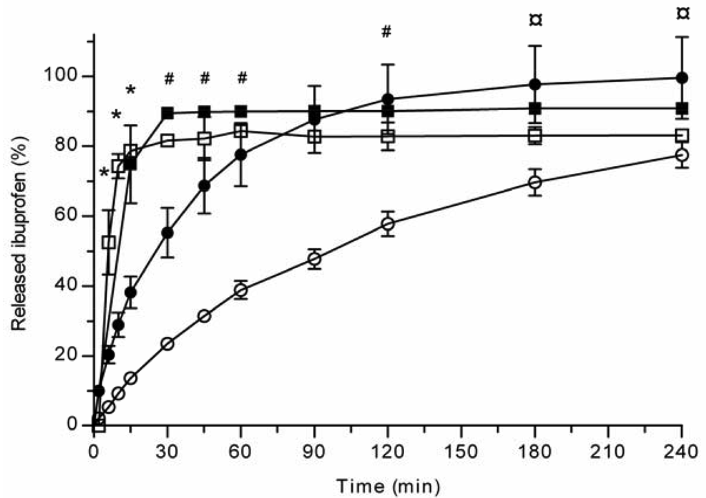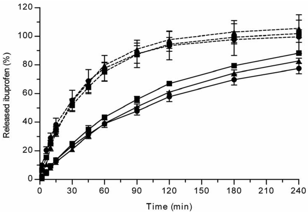 Ibuprofen release from the TCPSi microparticles was studied by the USP Apparatus 1 (basket) (Sotax AT6, Sotax AG, Basel, Switzerland) method. Ibuprofen-loaded TCPSi microparticles (40 mg) were weighed into soft gelatin capsules (size 00). The volume of pH 7.4 PBS was 900 mL (+37 °C) and the rotation speed of the basket was 100 rpm. Sink conditions were maintained for ibuprofen: the maximum theoretical concentration of dissolved ibuprofen was < 1 % of the saturation concentration. A sample of 5 mL was withdrawn at pre-determined time intervals and this volume was replaced by fresh buffer. The samples were filtered through a 0.45 μm Minisart filter (Sartorius, Goettingen, Germany) before the analysis of the drug concentration.