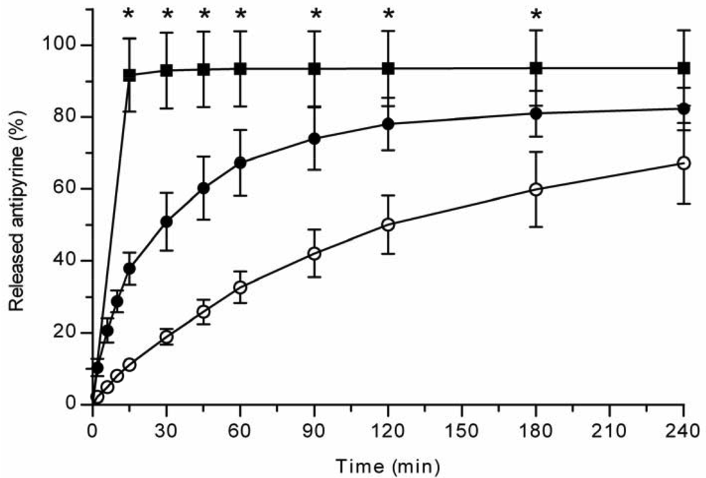 USP Apparatus 1 (basket), centrifuge and well plate methods were compared by using hydrophilic TCPSi microparticles loaded with a poorly soluble ibuprofen and freely soluble antipyrine (Table 1). In the present study, the solubility of ibuprofen at pH 7.4 PBS (+37 °C) was determined to be 1.68 mg/mL whereas antipyrine is freely soluble in water (>1000 mg/mL) [3]. High drug loading degrees were achieved for antipyrine loaded microparticles (56% w/w) and two batches of ibuprofen loaded microparticles (47% w/w for centrifuge and well-plate methods, 31% w/w for USP Apparatus 1). In addition, virtually no crystallized (<2% w/w) drug was observed on the external surfaces of the studied microparticles. The differences in the loading degrees of ibuprofen are due to different pore volumes of the particles, as a correlation between pore volumes and drug loading degrees has been recently demonstrated [6].