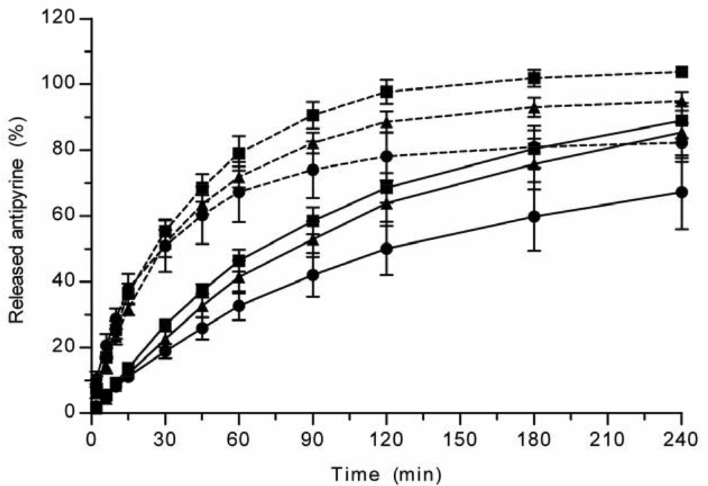 In the tests with the centrifuge and well plate methods, ibuprofen (λ = 220 nm) and antipyrine (λ = 240 nm) concentrations in the samples were analyzed with a UV-spectrophotometer (Thermo Spectronic Genesys 10, Madison WI, USA). In the tests with the USP Apparatus 1 (basket), ibuprofen concentrations were analyzed in a Gilson High Performance Liquid Chromatograph (HPLC). The system consisted of UV detector (UV/VIS-151), pump (321), autoinjector (234), interface (506C) and integrator (Unipoint 3.0). The mobile phase was a mixture of acetonitrile (70% v/v), water (30% v/v) and trifluoroacetic acid (0.1% v/v). The analytical column was a reverse-phase Supelcosil® C-8 column (150 × 4.6 mm id, particle size 5 μm, Supelco, Bellefonte, PA, USA). The injection volume was 20 μL, flow rate 1 mL/min, and ibuprofen was detected at 214 nm. GhA was analyzed with a similar HPLC system as used for ibuprofen but the interface unit was Hercule Lite for Borwin 1.5 and the integrator was a Borwin 1.5. The mobile phase was a mixture of acetonitrile (73% v/v), water (27% v/v) and trifluoroacetic acid (0.1% v/v). The analytical column was a reverse-phase Supelcosil® LC-18-DB column (150 × 4.6 mm id, particle size 5 μm, Supelco, Bellefonte, PA, USA). The injection volume was 100 μL, flow rate 1 mL/min, and ibuprofen was detected at 220 nm.
