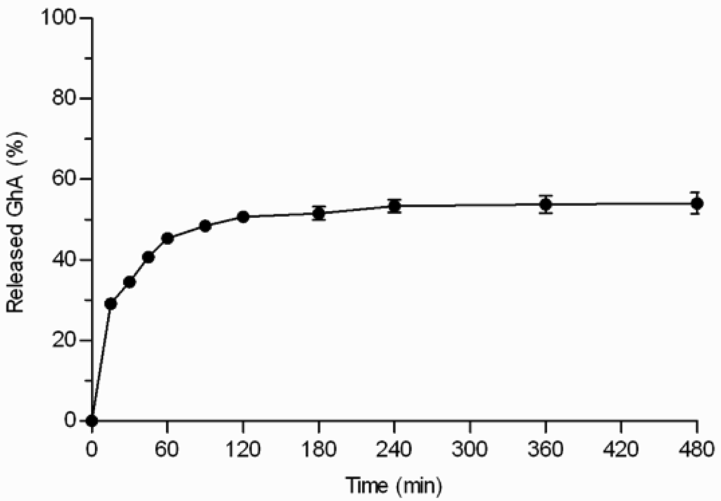 GhA loaded THCPSi microparticles (loading degree 7.8% w/w) displayed three phases: 1) burst phase; 2) diffusional release phase; and 3) plateau phase (Figure 5). The initial burst release of GhA (29%) occurred within the first 15 minutes. The burst release can be explained by the peptide located on the external surface of the particles and near to the pore orifices as well as release of the multilayers of peptides on the pores not in direct contact with the hydrophobic surface [6,17]. After the burst release, the release was sustained for 2–3 h, and the release reached a plateau when 54% of loaded GhA was released. Even the extraction of the microparticles with ACN/H2O mixture at the end of the experiment, did not achieve any additional release (Figure 5). This rather stable plateau between 3 and 8 h suggests that the interactions between GhA and THCPSi slowed down the GhA release and impaired its complete release. This kind of incomplete in vitro drug release from particulate drug delivery systems has been reported also earlier [18]. The incomplete release might be also explained by adsorption of BSA, present in the in vitro release medium to prevent peptide adsorption onto lab ware. In our studies, BSA was shown to adsorb onto the non-porous THCPSi surface (7.5% w/w) by thermogravimetric analyses [19]. Furthermore, earlier publications have reported human serum albumin adsorption onto a PSi surface [20,21]. Therefore, it is postulated that the BSA adsorption could hinder the release of GhA from the THCPSi pores, resulting in incomplete in vitro release.