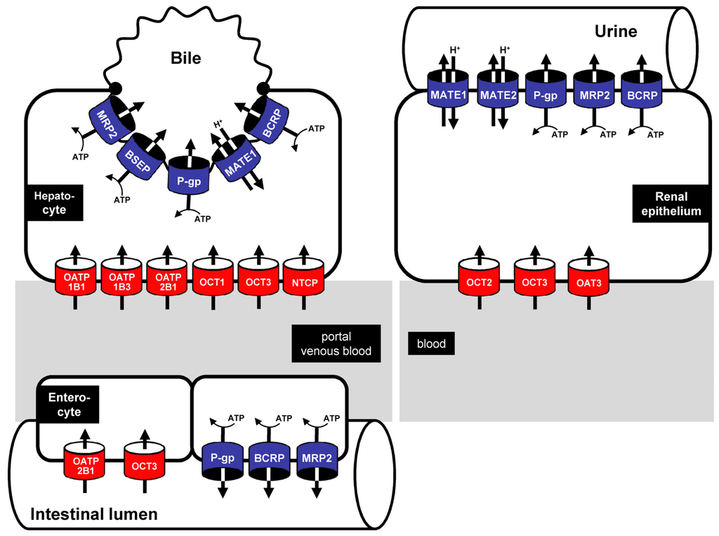 Efflux transporters mainly belong to the ATP-binding cassette (ABC) transporter family [30–33]. These export pumps use energy derived from ATP hydrolysis to mediate substrate transport, often against a concentration gradient. Today, the human ABC superfamily consists of 49 different ABC transporters grouped into 6 different ABC families [ABCA–ABCG (for detailed information see [34]). In the focus of the review are the ABCB family member P-glycoprotein (P-gp, ABCB1, [35]), the bile salt export pump BSEP (ABCB11) and the ABCG family member BCRP (ABCG2). P-gp and BCRP are expressed in enterocytes, hepatocytes and renal epithelial cells (Figure 1; [36–38]), whereas the expression of BSEP is restricted to hepatocytes (Figure 1; [39]).