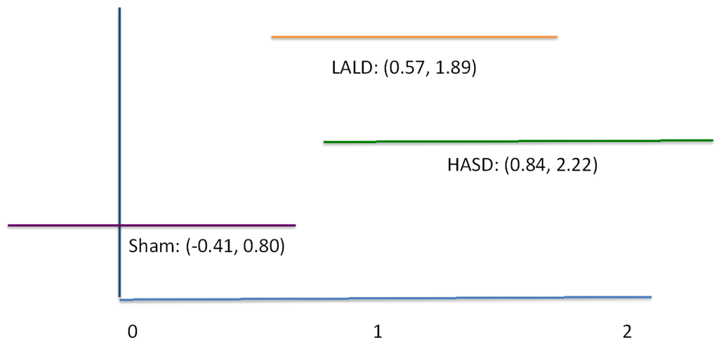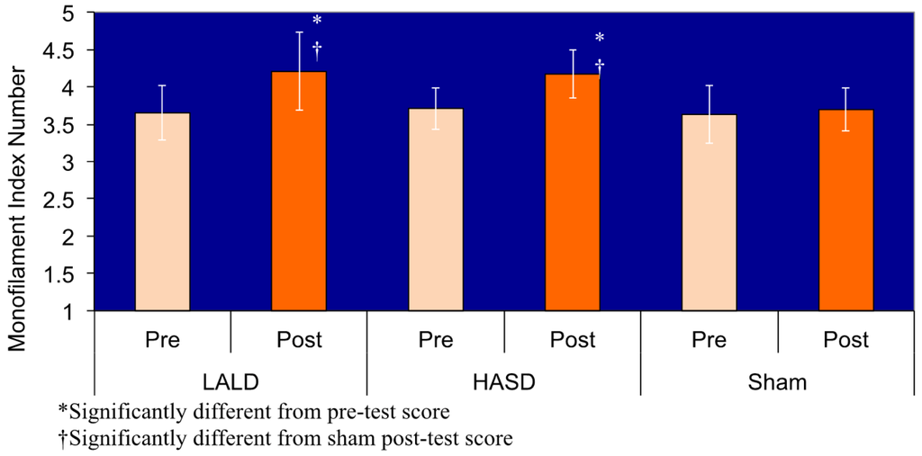 Data are presented in Table 1. There was a significant test by condition interaction (F2,40 = 6.950, P = 0.003). Pairwise comparisons revealed that there were no significant differences among any of the pretest measures, nor was there a difference in the pre and posttest scores in the sham condition. There was a significant difference between the post-test sensation measures for the LALD compared to the control condition (P = 0.001), as well as a significant difference between the HASD and control condition (P = 0.001), graphically represented in Figure 1. Both the HASD and the LALD conditions had strong effect sizes. However there was no significant difference between LALD and HASD post-test scores. Confidence intervals are reported in Figure 2.