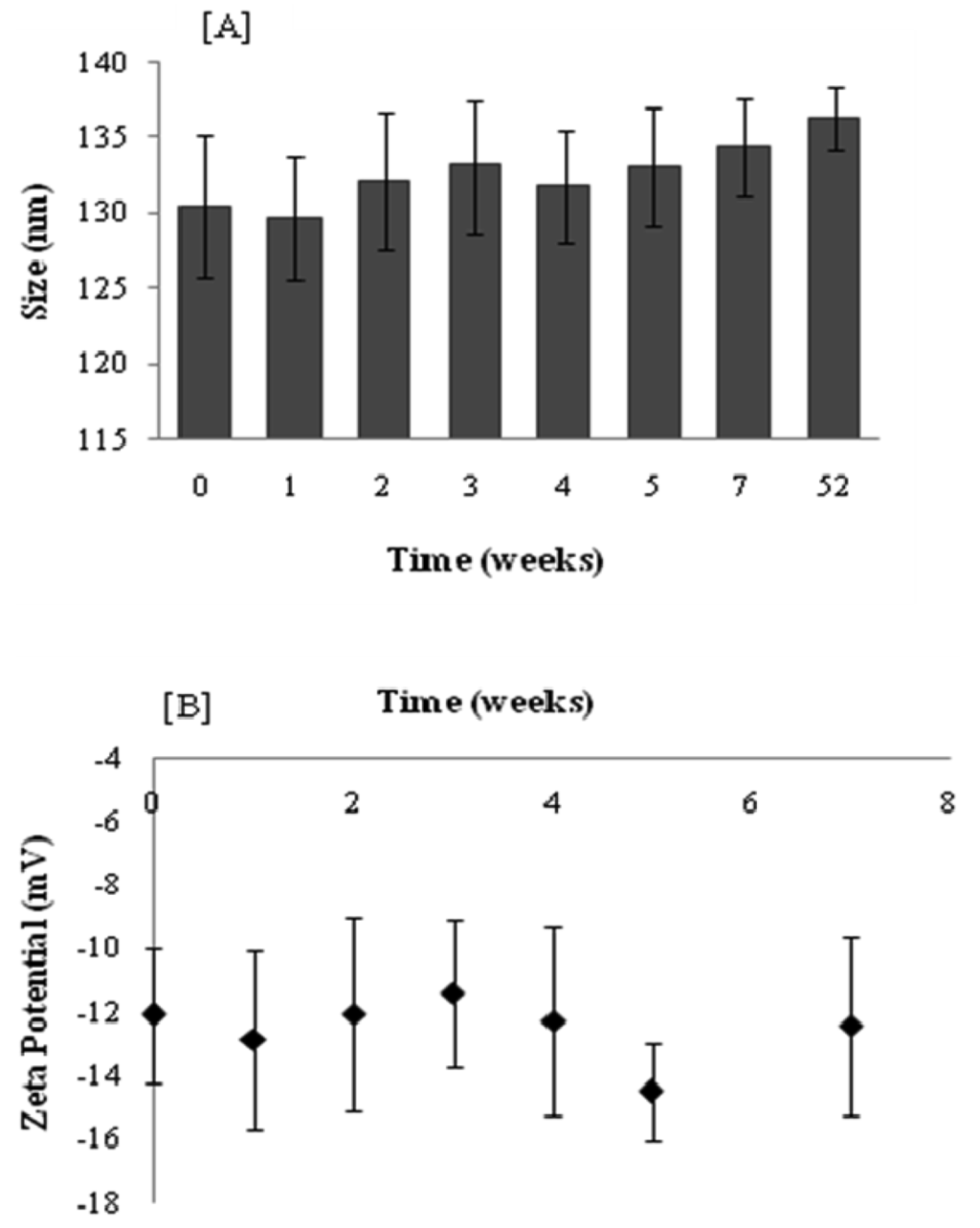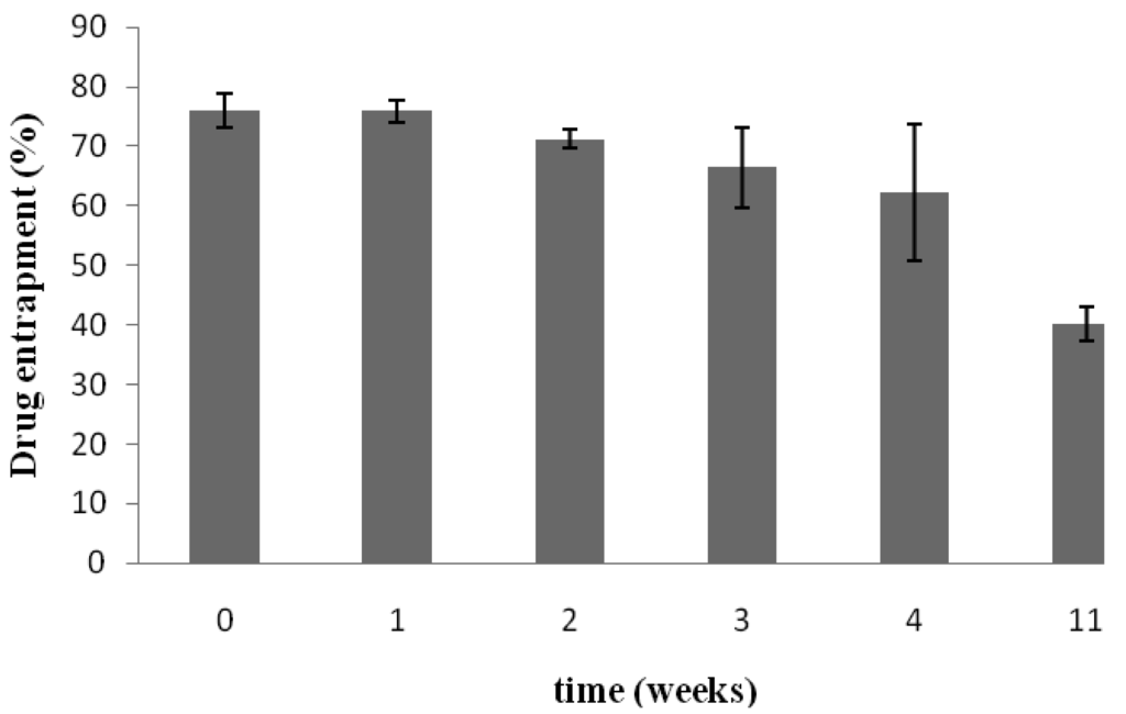 Figure 3A shows that under the storage conditions tested, elastic liposomes were stable without significant changes in vesicular size after one year of storage at 4 °C (size increase ∼4.5%). Figure 3B presents the zeta potential values that were monitored over a period of seven weeks. The zeta potential of elastic liposomes stored at 4 °C remained constant at around −12 mV. However, even if size and zeta potential did not change, the drug content fell ∼52% after 11 weeks with regard to the initial content (Figure 4). There were no significant differences between the first 3 weeks (Duncan's Test). In general, aqueous liposomal dispersions may suffer a series of stability problems such as aggregation and leakage of the encapsulated drugs. In this sense, freeze-drying may offer an alternative for storing liposome suspension, by preserving them in a more stable dry state [21].