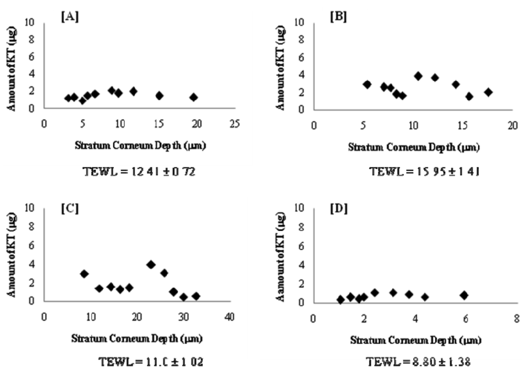 Most of the in vivo studies with elastic vesicles have been conducted in animals (e.g., mice, rats, rabbits). For studies in human beings, the tape-stripping technique has gained wide acceptability as a facile and minimally invasive method to evaluate skin drug permeation. Several reports are available in the literature [28,29] on this method. In this work, in vivo permeation of KT was evaluated using a well-established tape-stripping technique on six healthy human volunteers. As differences in stratum corneum cohesiveness results in different amounts of stratum corneum removed from each volunteer and therefore different stratum corneum depths, the quantity of KT in the stratum corneum as a function of depth in the skin is presented individually in Figure 7. Although the drug penetration profile showed a high inter-individual variability, this could be attributed to the individual skin type and to the barrier properties of each person. For this reason, Transepidermal Water Loss (TEWL) was recorded for all volunteers prior to treatment and as shown in Figure 7, TEWL values varied from 8.8 to 15.95 g/hm2. Therefore, it was not surprising to find inter-individual variability, taking into account the penetration mechanism of elastic vesicles and its relationship to hydration gradient.