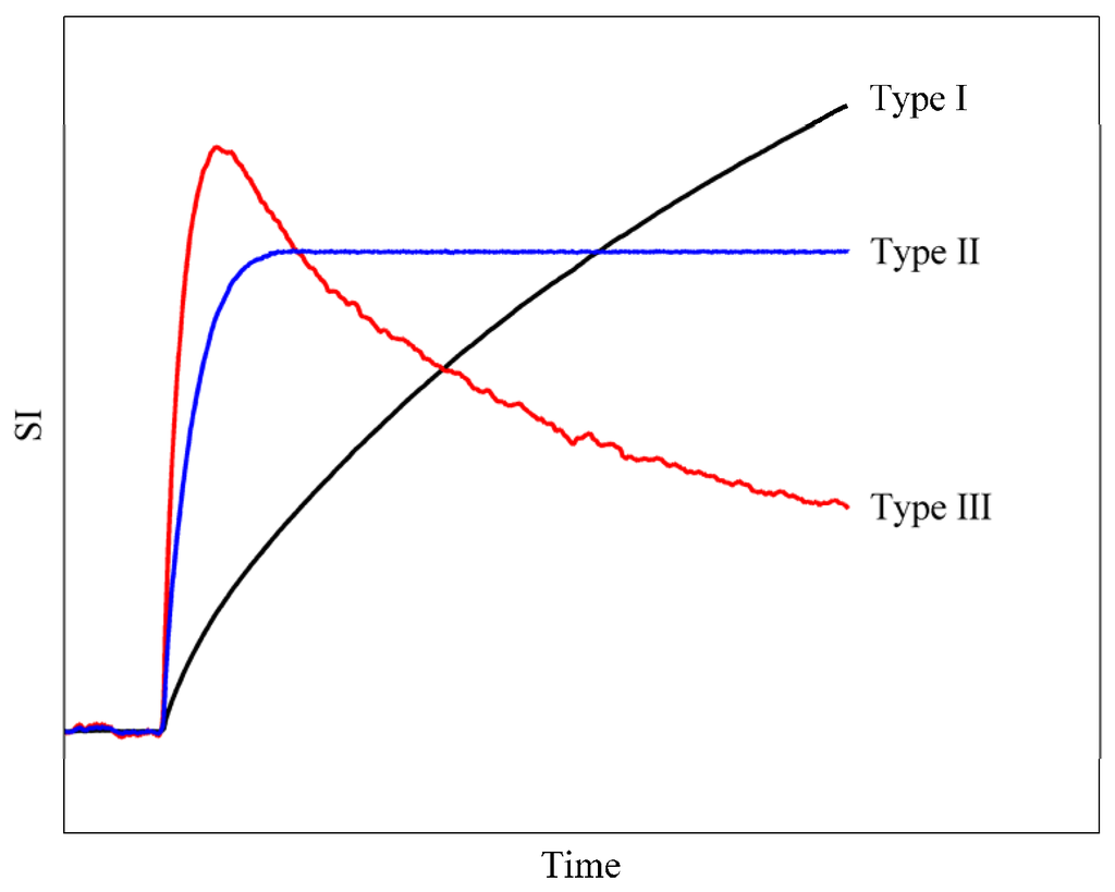 Qualitative analysis relies on an evaluation of the signal intensity curve behavior in the voxel or ROI. The shape of the curve is typically placed into one of three general categories: type I, type II, or type III [61,62,63,64]. A type III shape is defined by the decrease in signal intensity after the peak signal intensity achieved during the initial phase of the curve. Type II curves display a signal intensity that remains relatively constant in time after the initial peak. The final category, type I, defines a curve in which the signal intensity continues to increase during the acquisition time. Representative curves for each of the three categories are shown in Figure 1. The advantage to qualitative analysis is that the only necessary component is the dynamic signal intensity curve; in particular, qualitative analysis does not necessitate acquisition of the pre-contrast T1 map (Section 2.3) or knowledge of the arterial input function (AIF - Section 2.5). However, a major disadvantage to a qualitative analysis is that it does not provide quantitative parameters that are directly related to the underlying physiological tissue characteristics. It also makes comparisons between results achieved at different sites difficult because signal intensity has no physical units and can be influenced by technical image acquisition parameters. However, this does not eliminate the benefit of qualitative analysis, as evaluation of curve shape has been able to discriminate, e.g., between benign and malignant breast tumors [64,65]. (It should be noted that qualitative assessment of tumor morphology is often used as an adjunct to DCE analysis, and, in fact, can be improved by assessing the morphology of the enhancing region in a DCE acquisition; the interested reader is referred to, e.g., [66,67,68,69].).