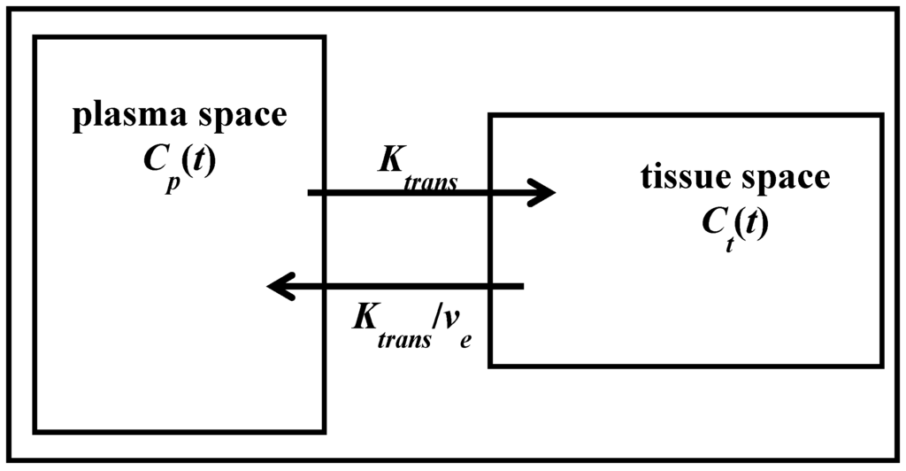 Two compartment model showing one compartment representing the plasma space while the other compartment is the tissue space. The contrast agent leaves the plasma space at a rate represented by Ktrans (the volume transfer constant) and returns by Ktrans/ve (the efflux constant).