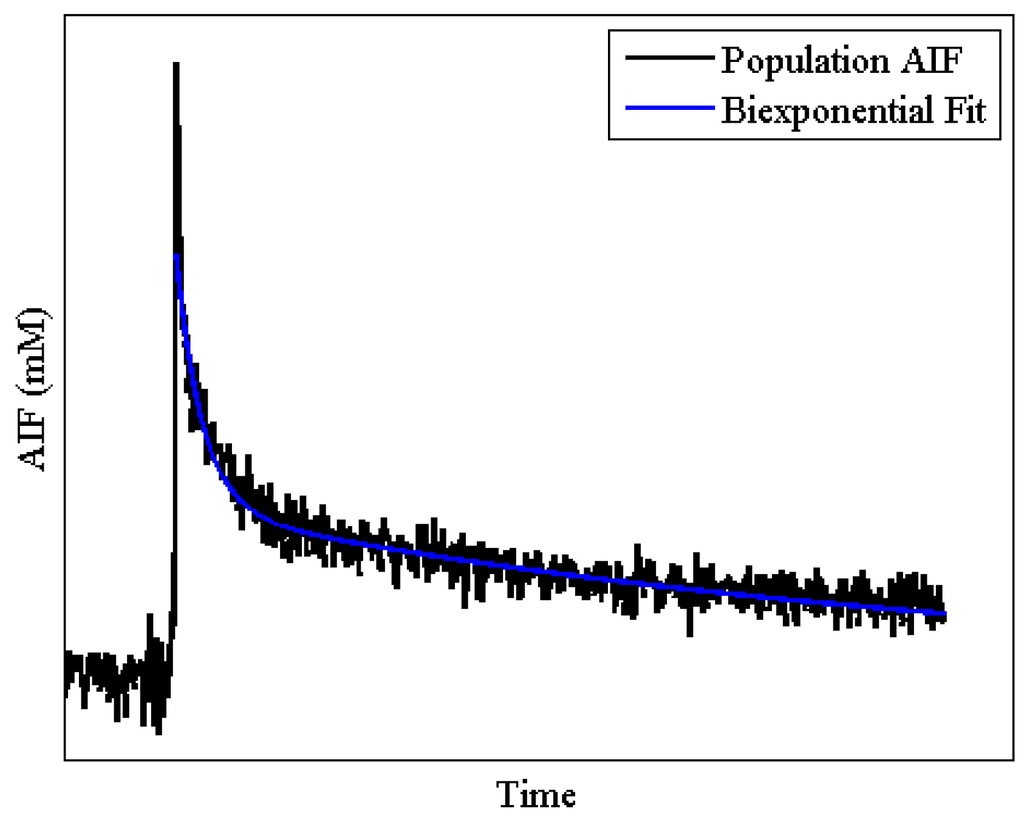 The gold standard for AIF characterization is blood sampling [96]; however, sampling is very invasive and in small animal imaging, where the subjects generally have a small blood volume (e.g., a mouse has a total blood volume of approximately 2 mL), the number of samples that can be collected is quite limited. Furthermore, the sampling is typically taken from a vessel far away from the tissue of interest and may not be an accurate indicator of what AIF the tumor actually experiences.