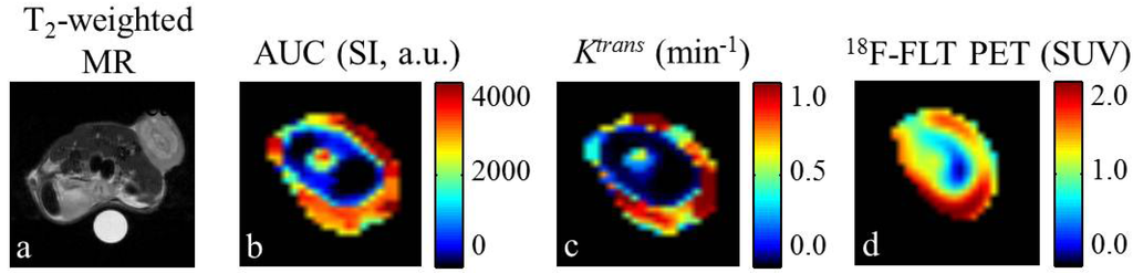 Semi-quantitative analysis consists of a group of parameters that require calculation based on curve properties. Typical semi-quantitative values are area under the curve (AUC), enhancement, time to peak, and wash-in/wash-out slope [63,70] as illustrated in Figure 2. The initial AUC is calculated as the area under the voxel or ROI signal intensity (or concentration, if the pre-contrast T1 map is obtained) curve from the time of injection to some designated time post-injection, usually 60 or 90 s. The enhancement is quantified as the change in signal intensity from baseline, divided by the baseline signal intensity value. Time to peak is designated as the time from injection of the CA to the maximum of the signal intensity curve. The wash-in and wash-out slopes are defined as the slope of the dynamic curve from the point of injection to the peak of the curve, and the slope from the peak until the end of acquisition, respectively. The benefits and disadvantages related to semi-quantitative analysis are similar to those in the qualitative analysis. Namely, benefits of a semi-quantitative DCE-MRI approach include the less complicated and time consuming acquisition requirements (e.g., semi-quantitative methods do not require AIF measurement) and the ease with which the post-processing can be accomplished. Similar to qualitative approaches, the disadvantages of semi-quantitative approaches include that it is difficult to directly relate these measures to underlying physiology, and to compare results achieved at different sites. However, broad correlations can be established between semi-quantitative parameters and underlying physiology. For example, increased vascular density and/or vascular permeability will likely increase the wash-in slope, AUC, and peak enhancement, while decreasing the time to peak. Additionally, the cell density of the region can affect the wash-out slope by decreasing the available space for CA to pool. Semi-quantitative methods have been used to assess the effect of anti-vascular drugs in clinical [55,56] and preclinical settings [21,57,58,59]. For example, Robinson et al. utilized the AUC for the first 150 s after injection to evaluate the effect of an anti-vascular agent on tumor perfusion in a rat model of thyroid cancer [21]. The results showed a marked shift in the histogram of voxel-based AUC values after treatment, indicating a decrease in tumor perfusion. Marzola et al. used the AUC to evaluate the effect of a tyrosine kinase inhibitor in a murine model of colon cancer [58]. The results showed a significant decrease (p < 0.05) in the AUC (92 s) between the pre-treatment and 24 h post-treatment acquisitions. Tang et al. used the AUC (90 s) to determine the effect of tumor necrosis factor α (TNF-α) on tumor microvasculature of colon adenocarcinomas implanted on the hind limb of mice [59]. The authors found a significant decrease in the AUC at 6 h and 96 h post treatment.