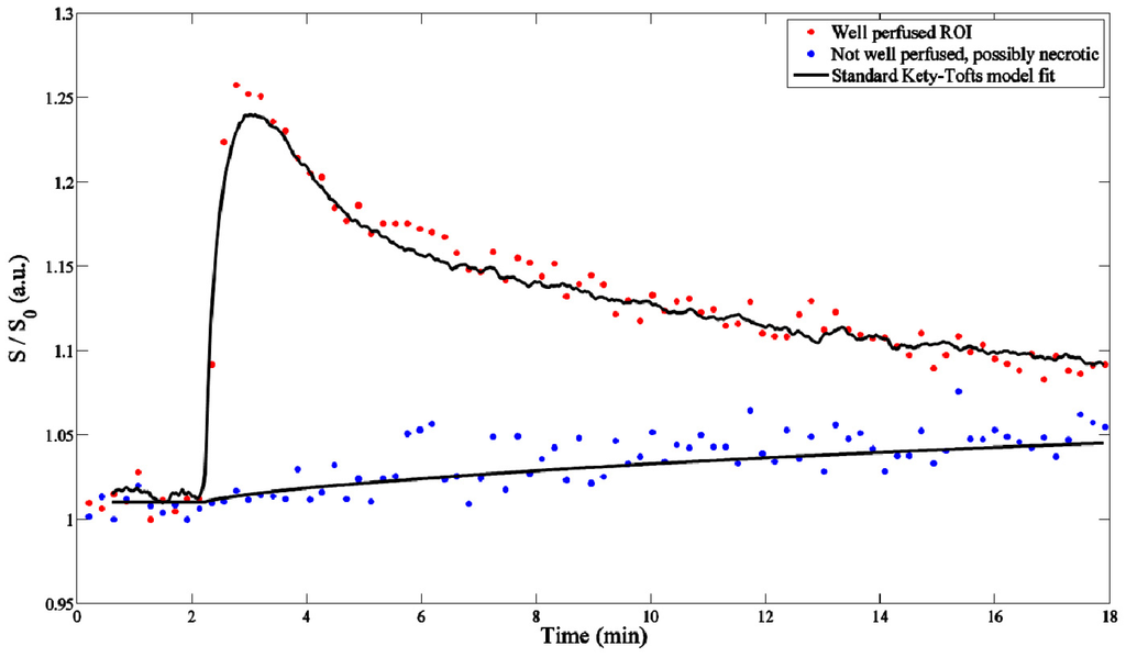 The RR approach was originally introduced by Kovar et al. [105]. The authors used the differential form of the equation to evaluate mammary adenocarcinomas and prostate tumors in rats. An estimation of the plasma concentration of CA was obtained from the muscle reference region using assumed values of the product of the perfusion rate and extraction fraction and extracellular volume. The plasma concentration was then used to optimize the values of the extracellular fraction and the product of the perfusion rate and extraction fraction in the tumor. The authors found that the errors in the tumor data fits produced by this approach were not significantly different than the noise level. Work by Yankeelov et al. evaluated the use of the RR model to characterize the tumor ROI [108]. The authors compared the Ktrans and ve values obtained from the RR analysis in nine rats to the Ktrans and ve values obtained using the standard Kety-Tofts model and the individual measured AIF, which was obtained using a combination of blood sampling and imaging of the aorta. The results indicated no significant difference between the two sets of parameters. The RR approach has its advantages in relative ease of image acquisition and in that it eliminates the need to characterize the AIF; however, if the reference region characteristics differ from those assumed from literature, or if the reference region is poorly characterized, the accuracy of the method decreases.
